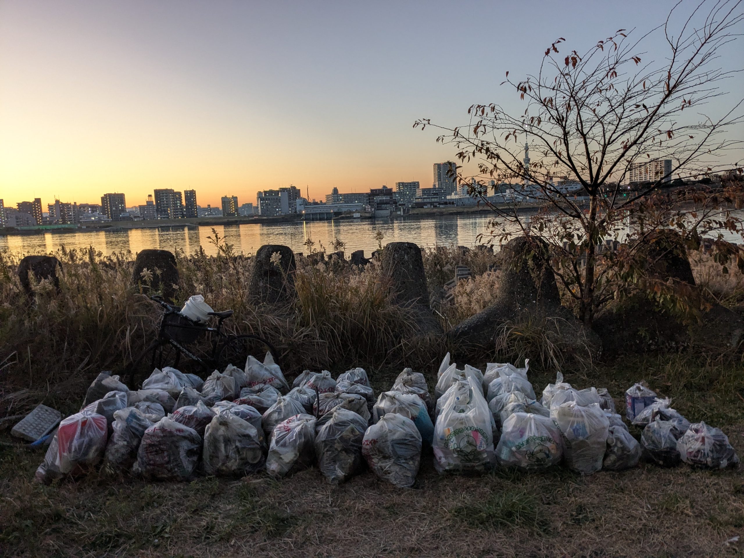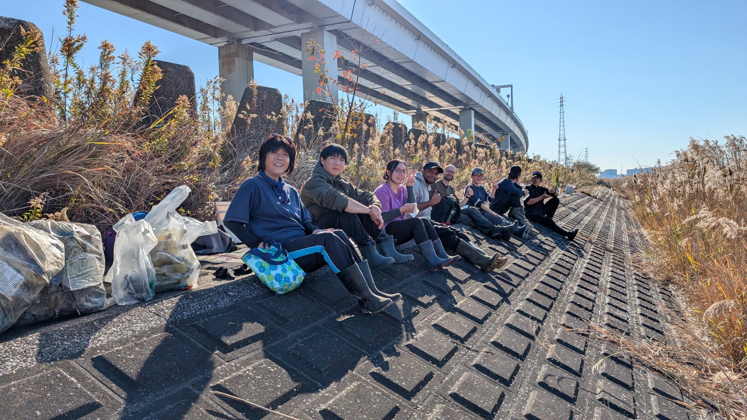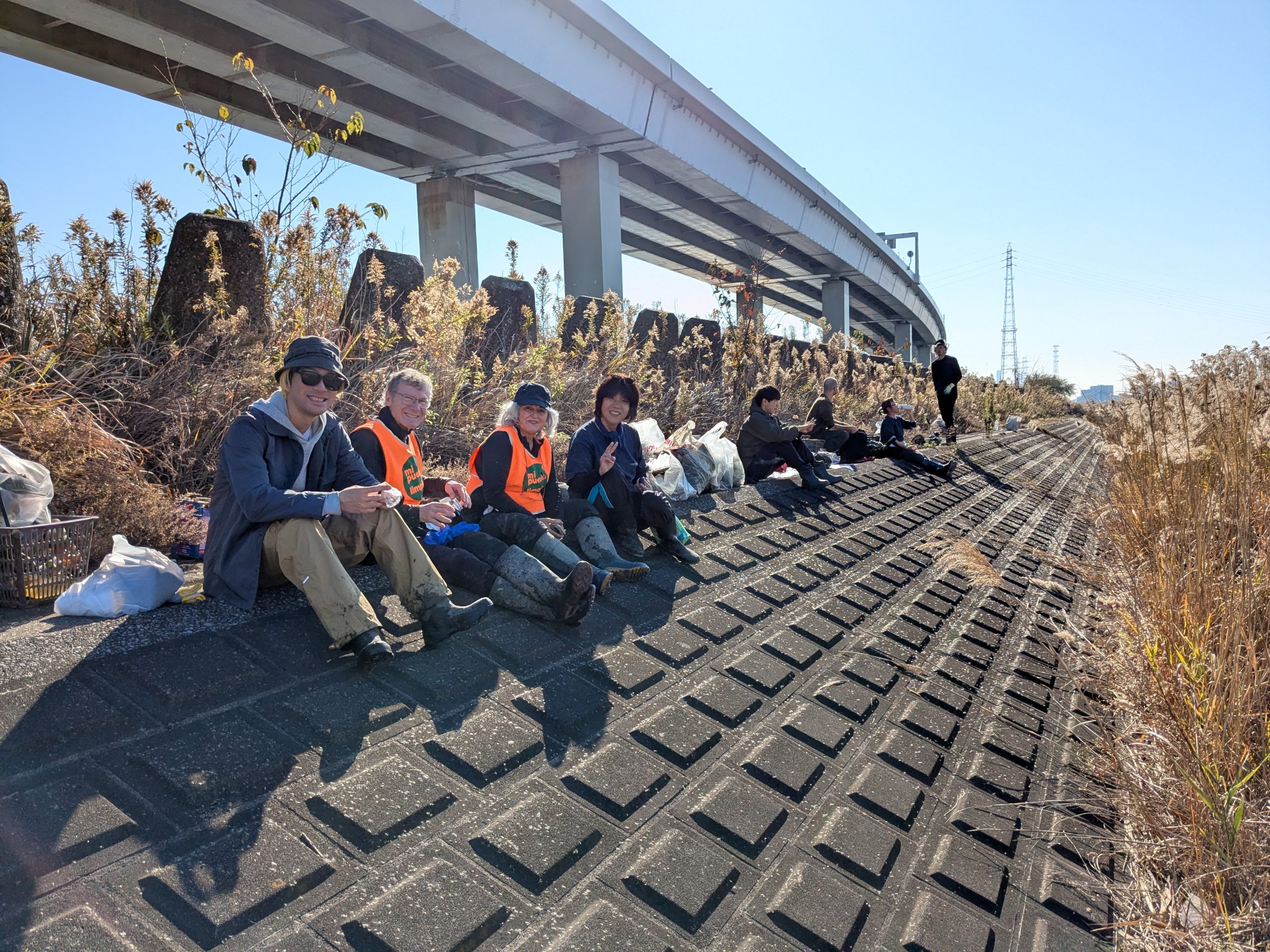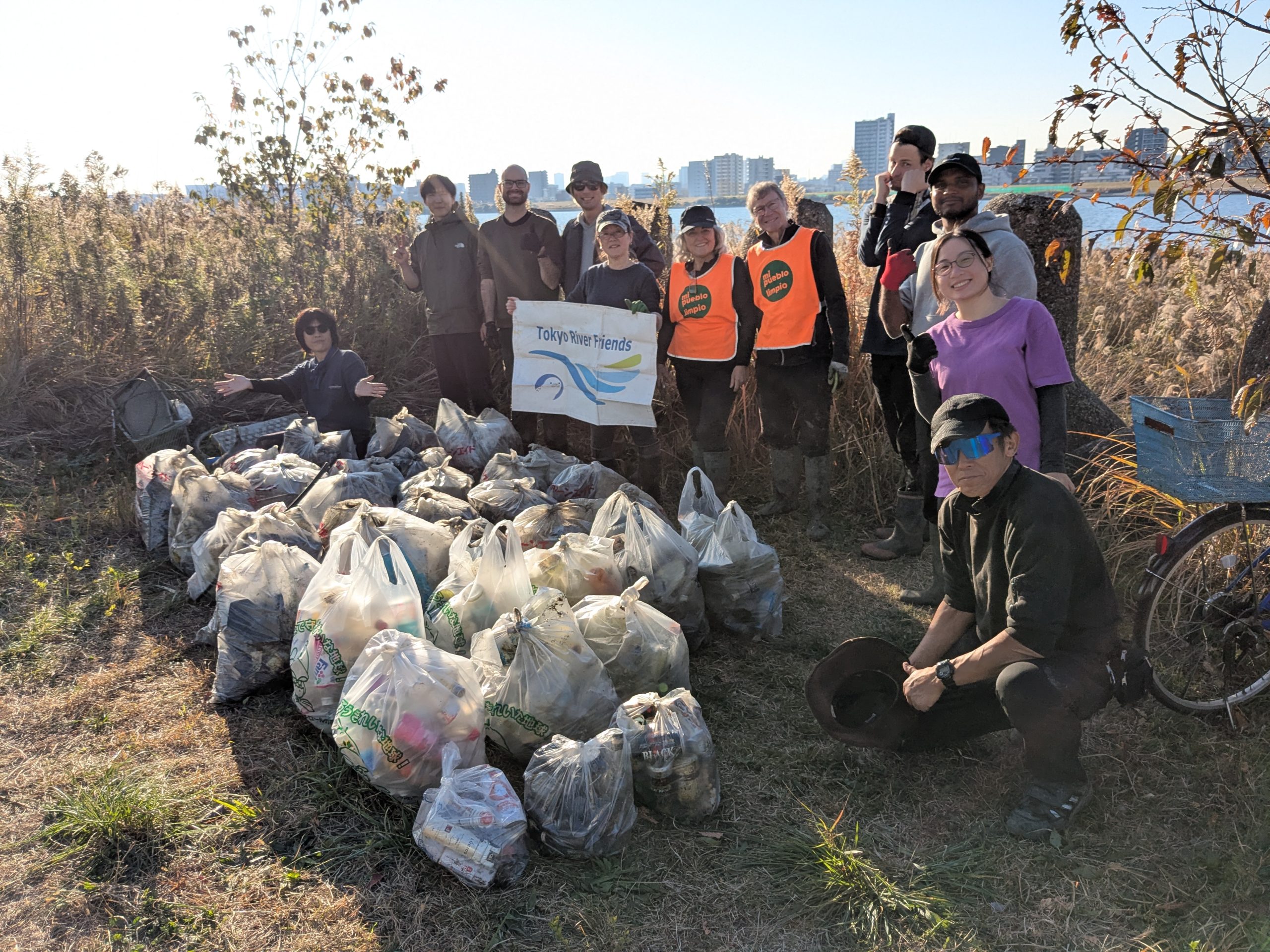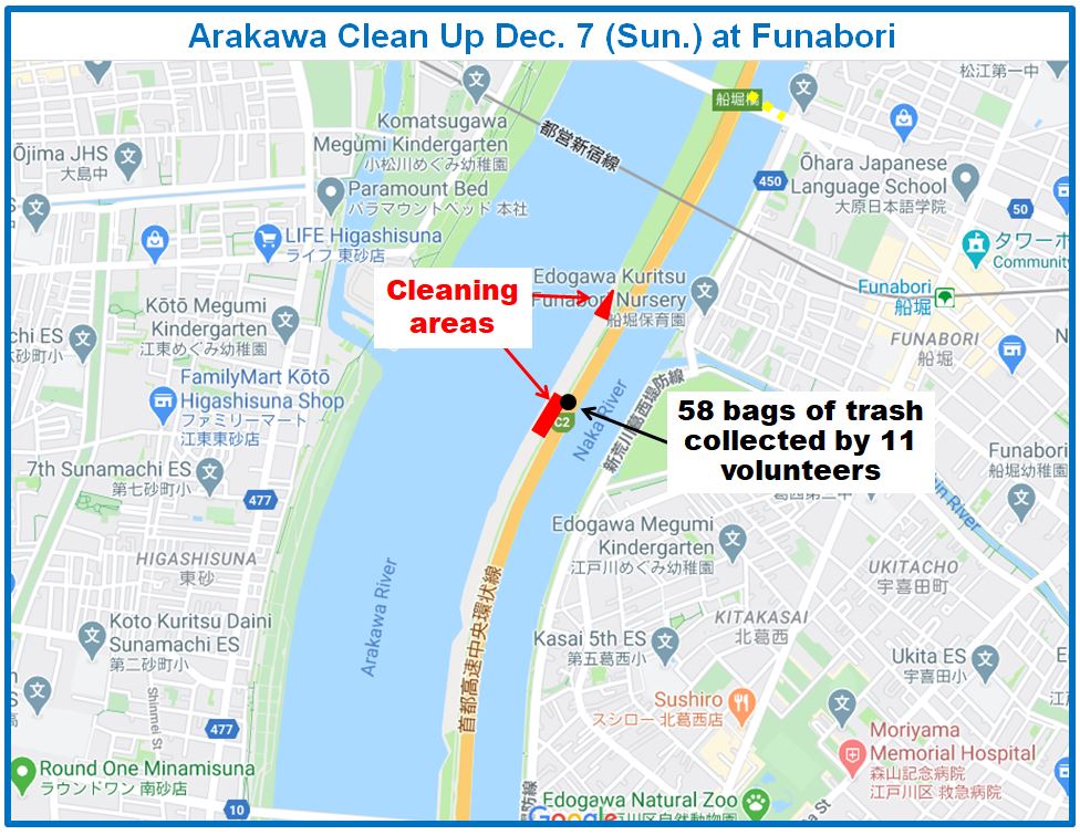 It was a big day on the Arakawa today with 11 volunteers collecting 58 bags of trash at Funabori. Again, it was great weather and a great effort by everyone to really collect a lot of trash. A couple, who organize a similar group in Spain, joined us today for a second time after joining about three years ago (wearing orange vests from their group). They also helped clean the dirty angle after the event finished which added about 14 bags to the total after the main group collected about 44 bags at the second pod section. Mina-san otsukaresama desu!
