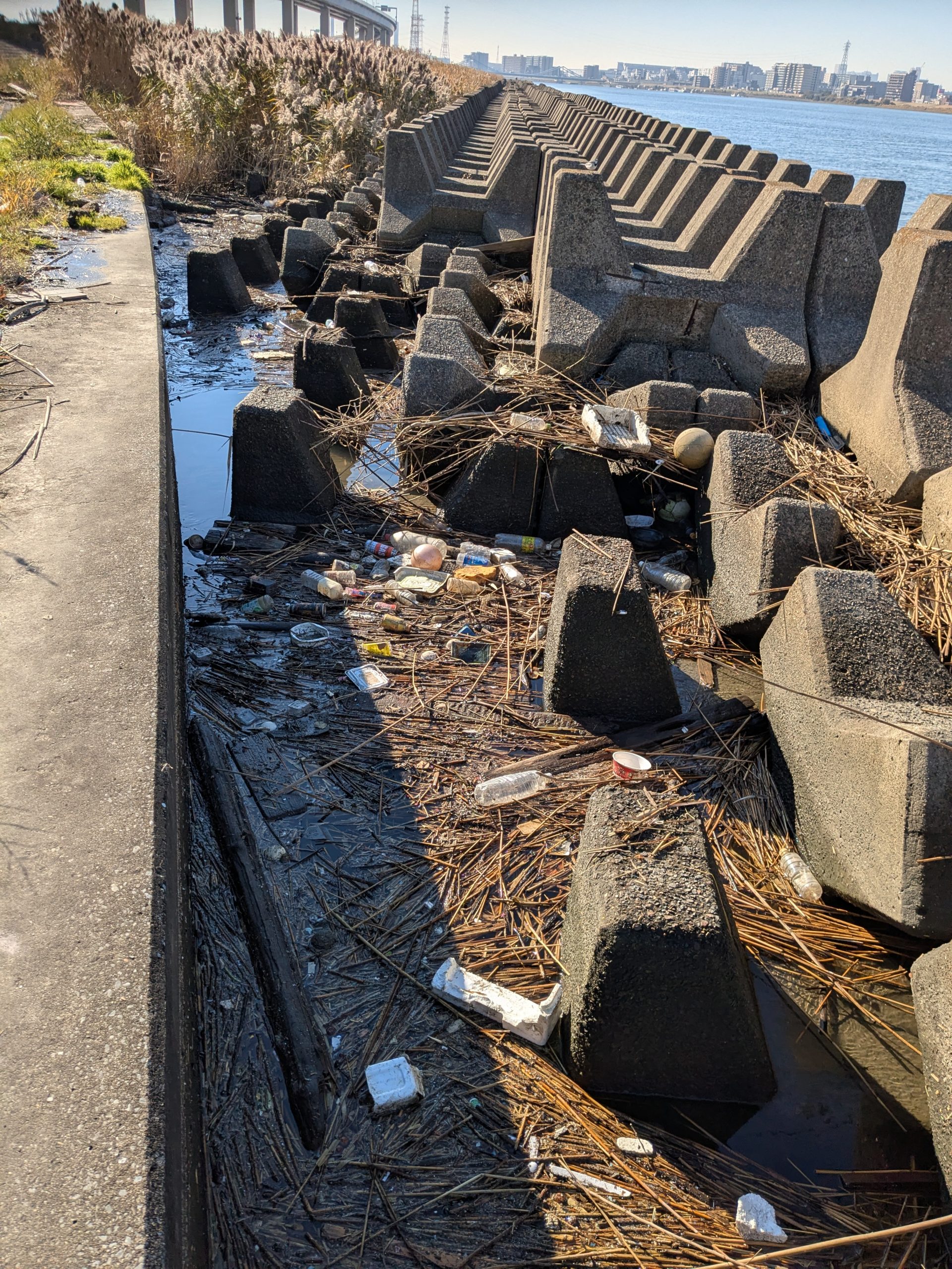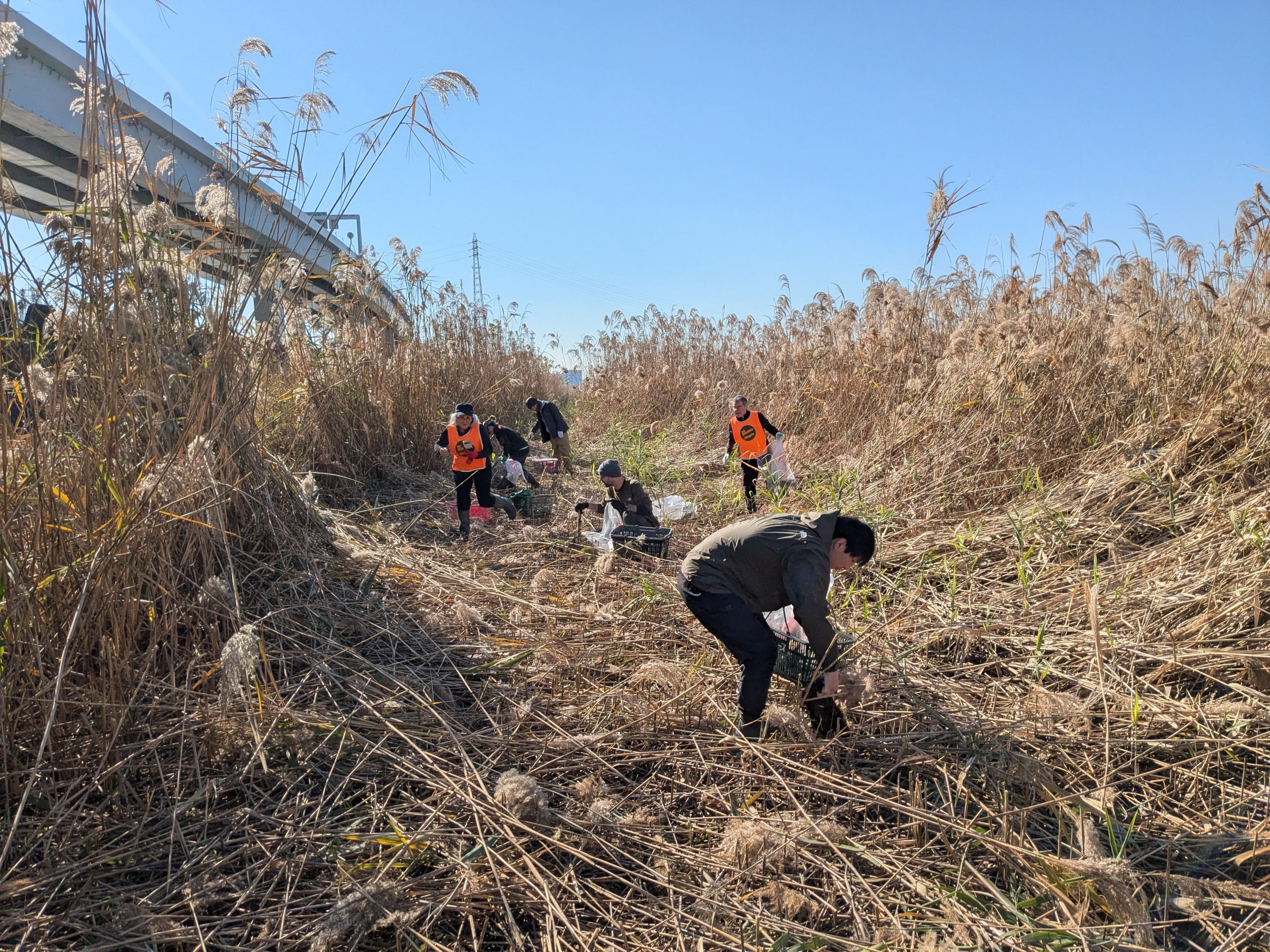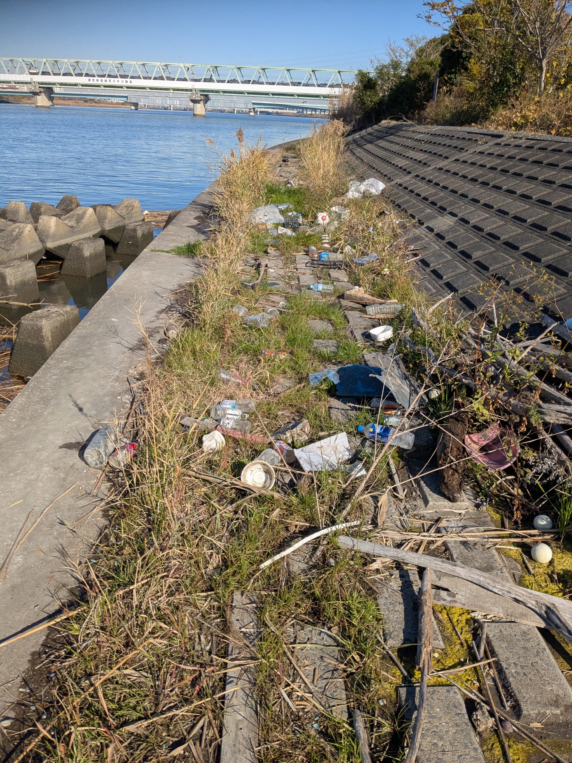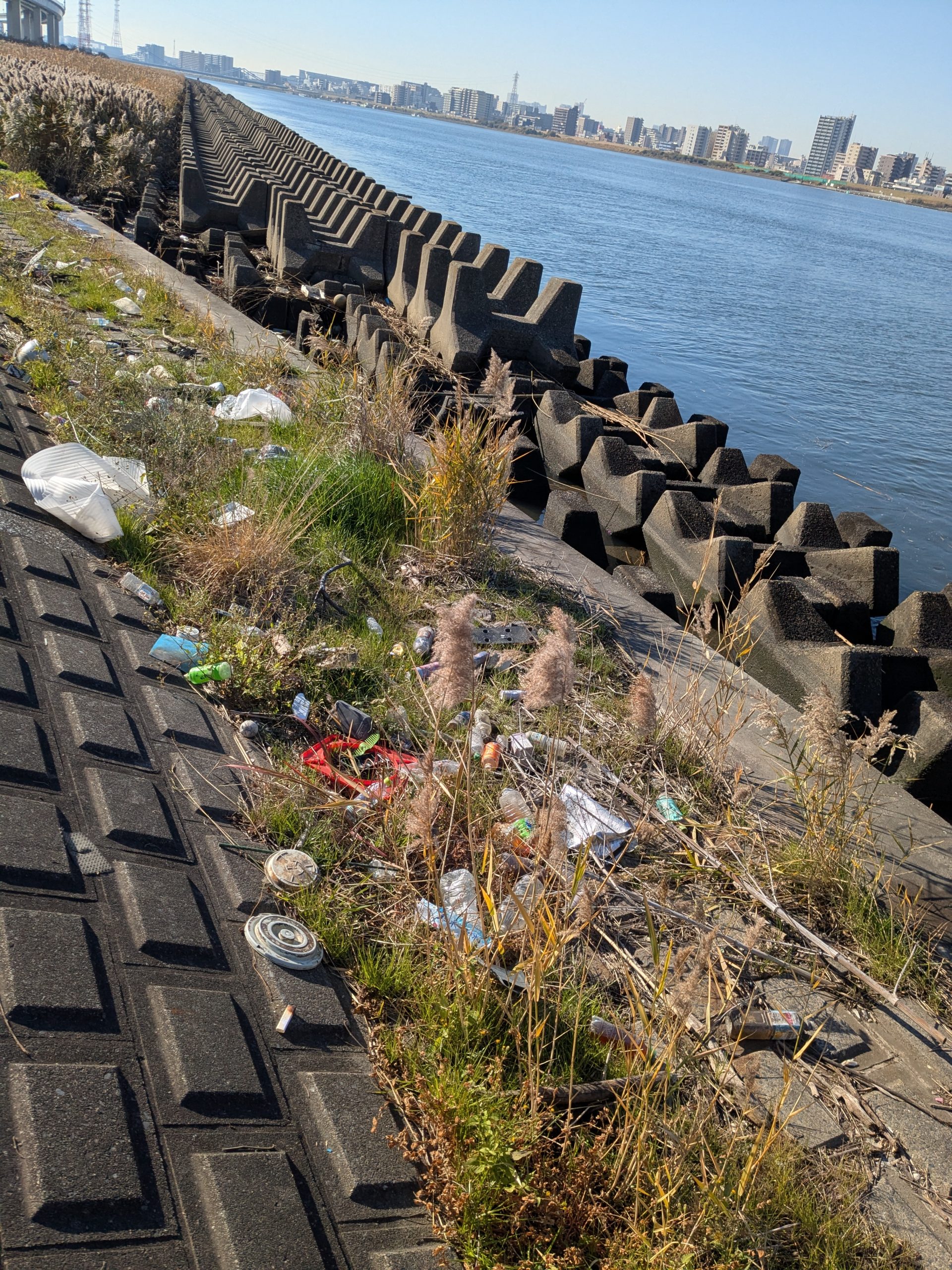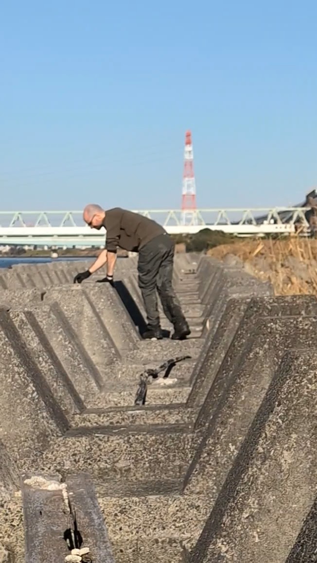 It was a big day on the Arakawa today with 11 volunteers collecting 58 bags of trash at Funabori. Again, it was great weather and a great effort by everyone to really collect a lot of trash. A couple, who organize a similar group in Spain, joined us today for a second time after joining about three years ago (wearing orange vests from their group). They also helped clean the dirty angle after the event finished which added about 14 bags to the total after the main group collected about 44 bags at the second pod section. Mina-san otsukaresama desu!