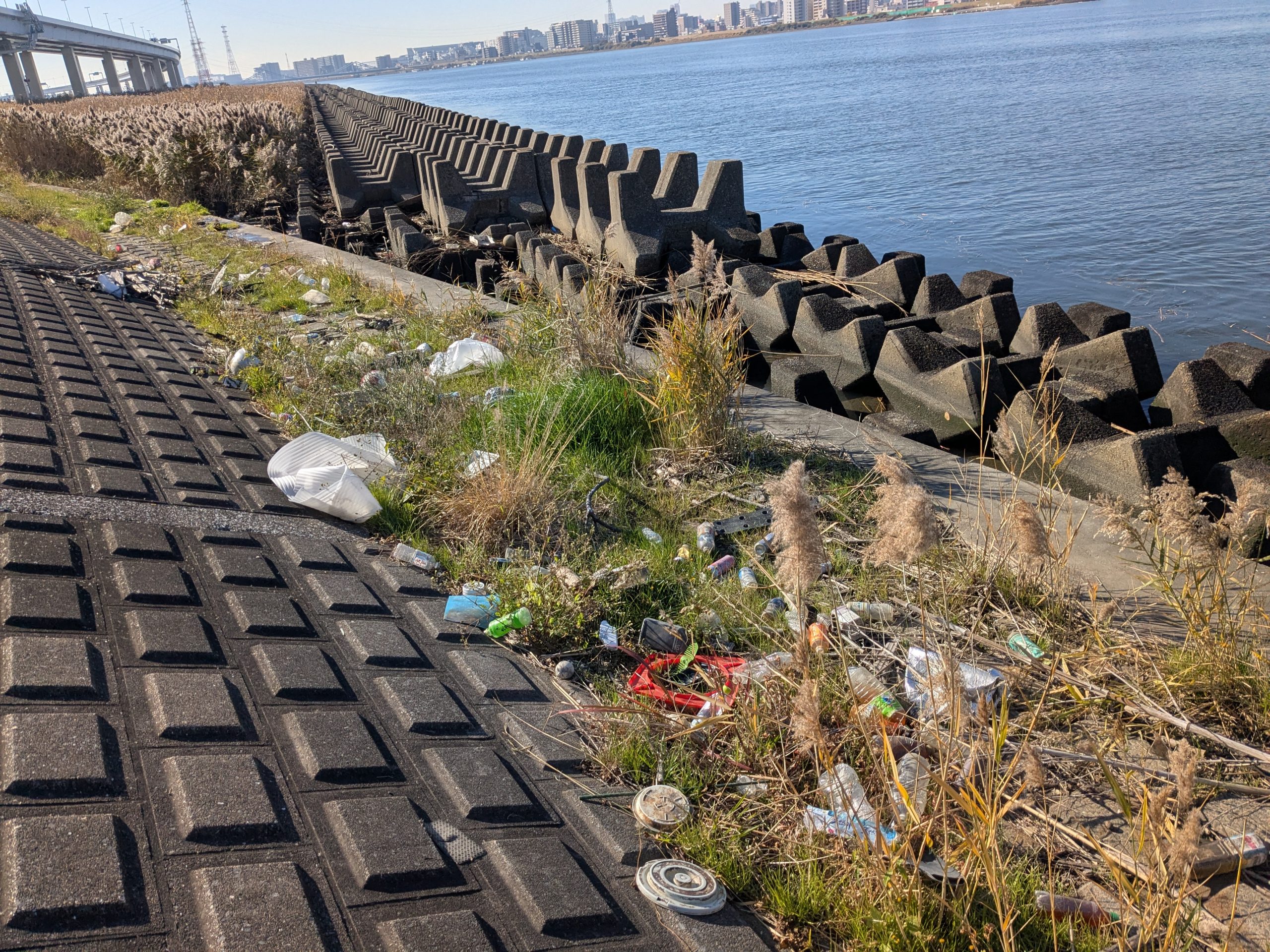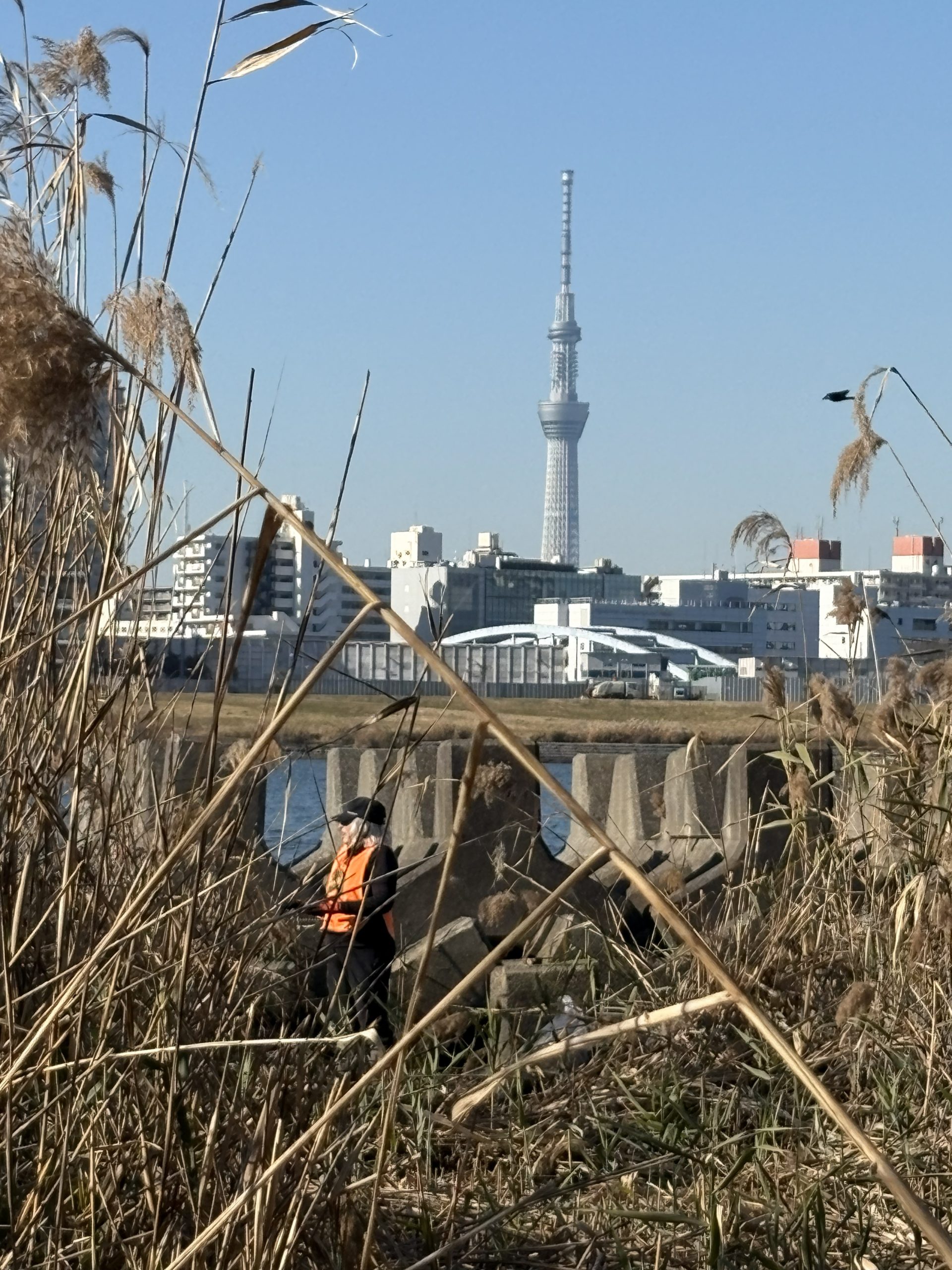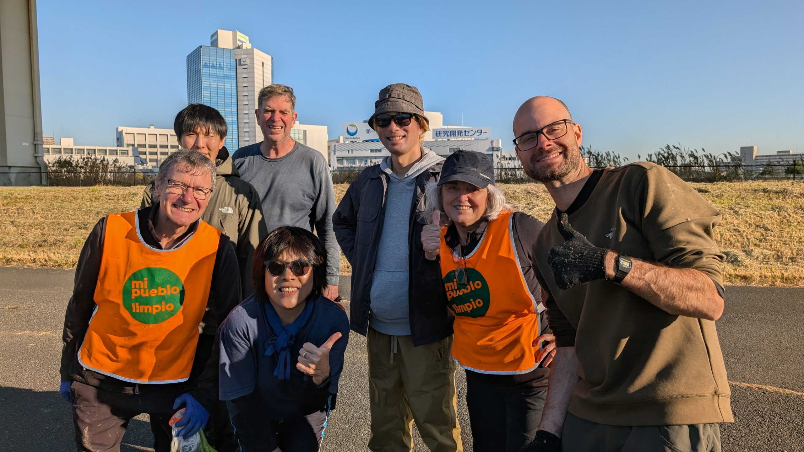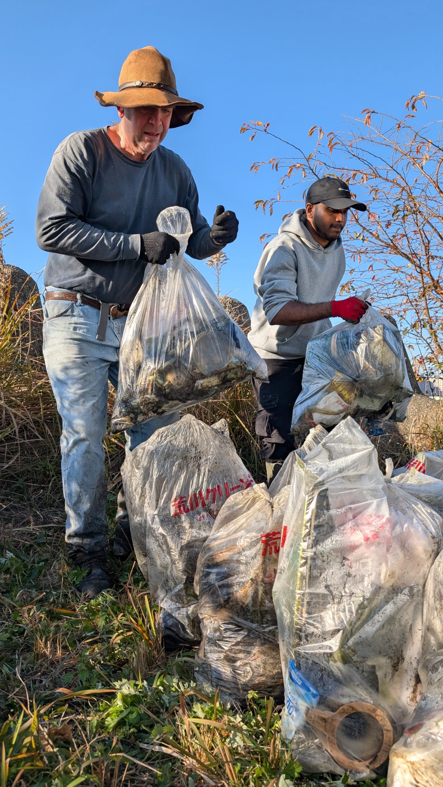 It was a big day on the Arakawa today with 11 volunteers collecting 58 bags of trash at Funabori. Again, it was great weather and a great effort by everyone to really collect a lot of trash. A couple, who organize a similar group in Spain, joined us today for a second time after joining about three years ago (wearing orange vests from their group). They also helped clean the dirty angle after the event finished which added about 14 bags to the total after the main group collected about 44 bags at the second pod section. Mina-san otsukaresama desu!