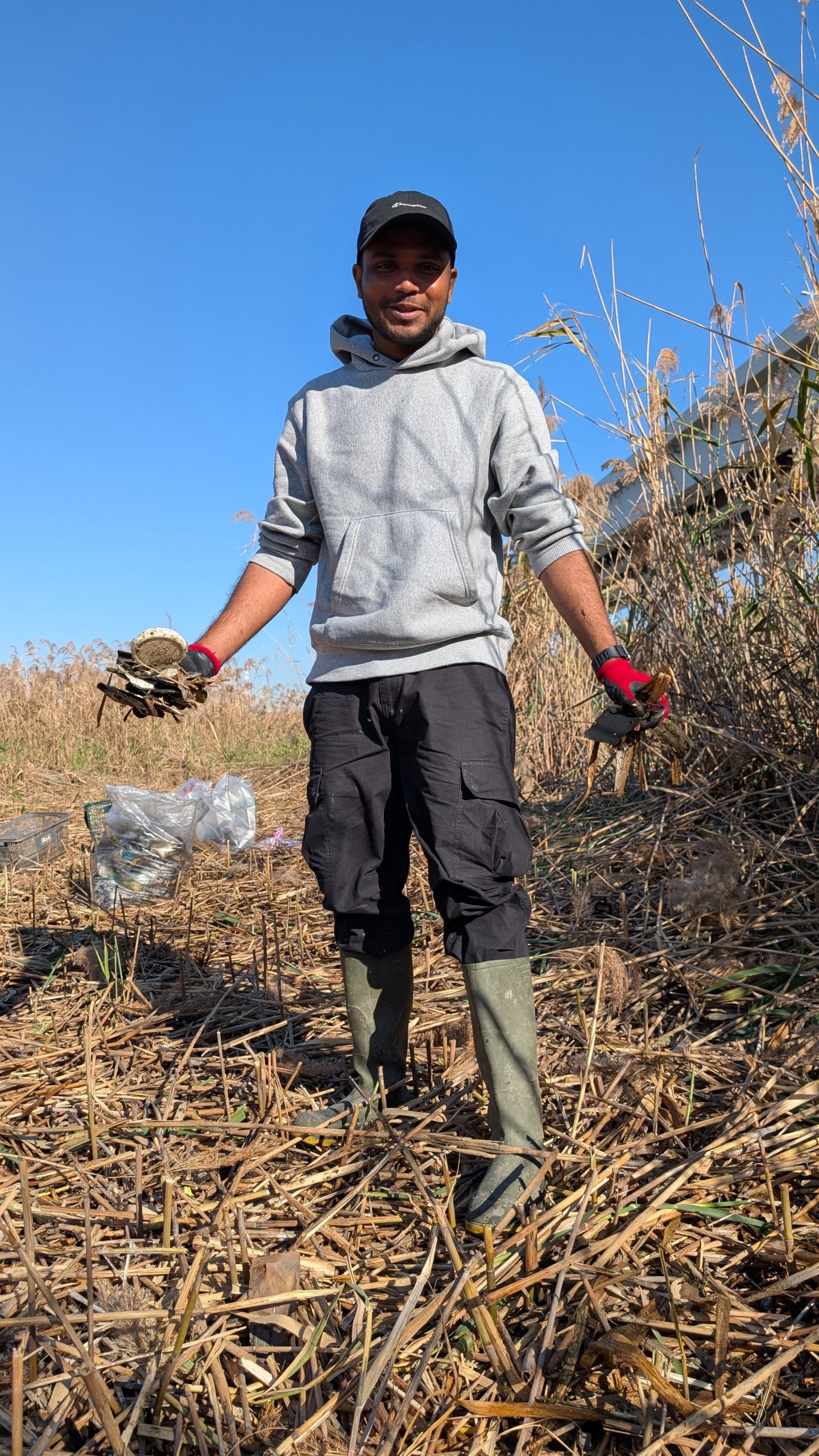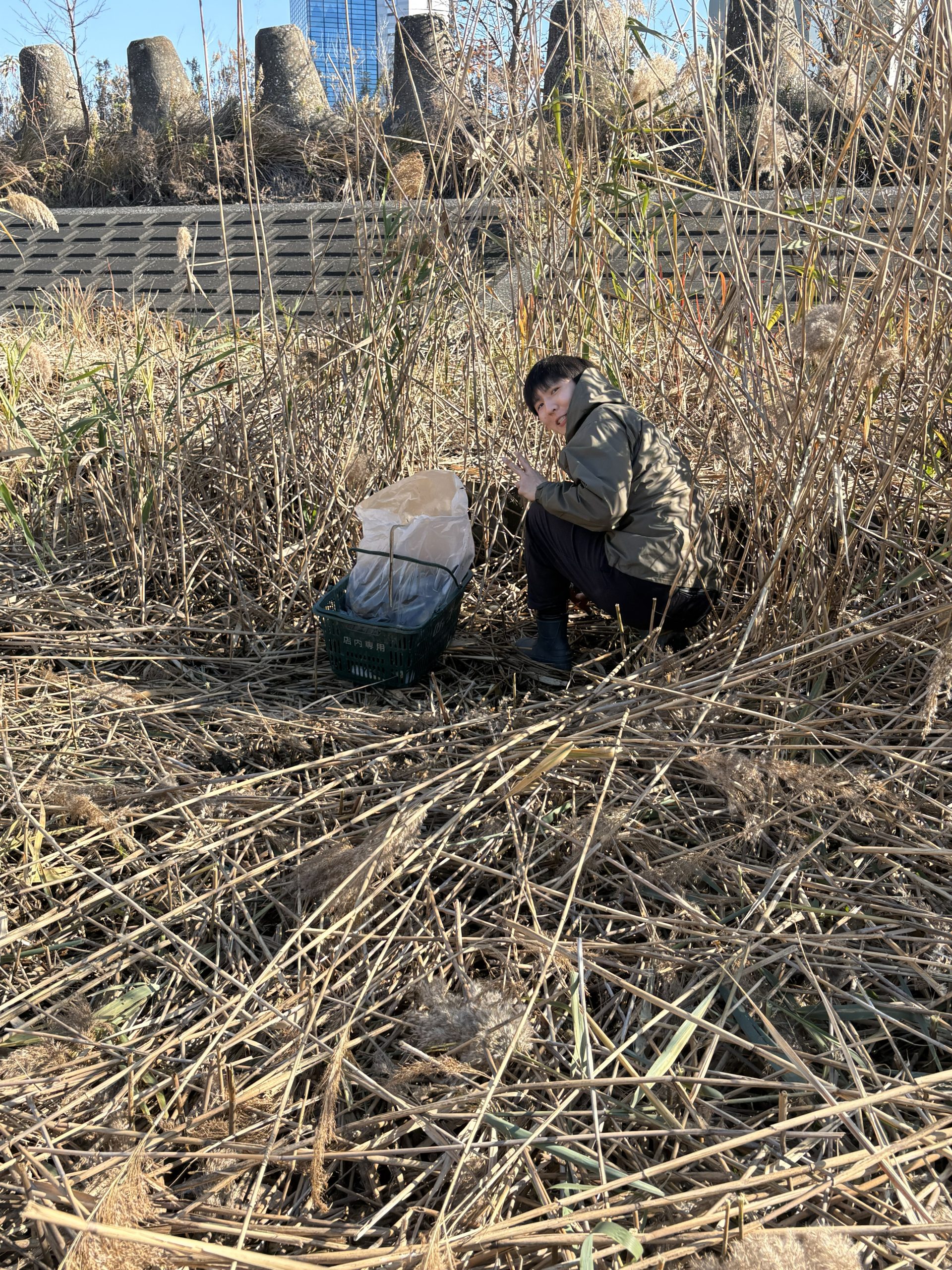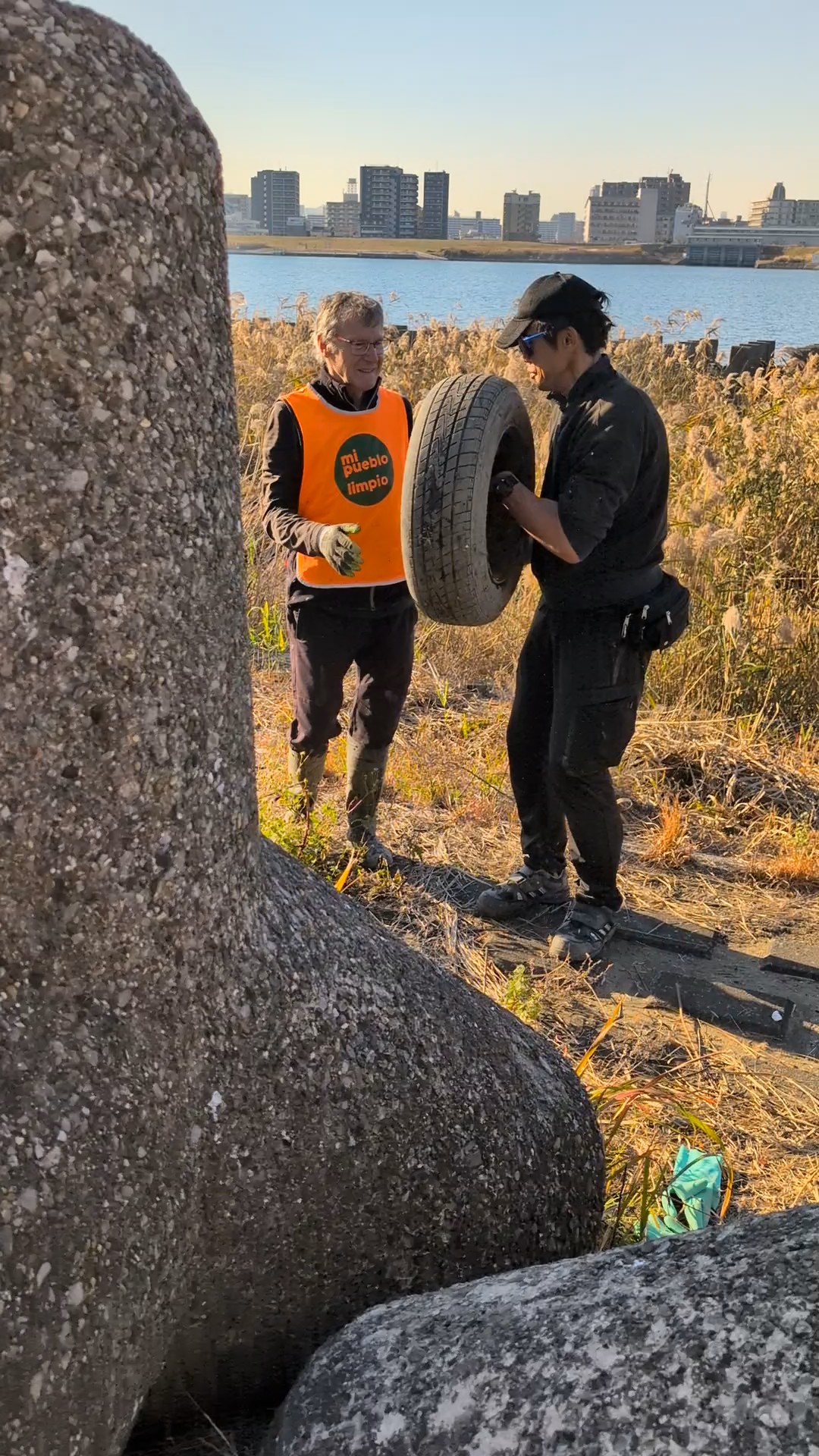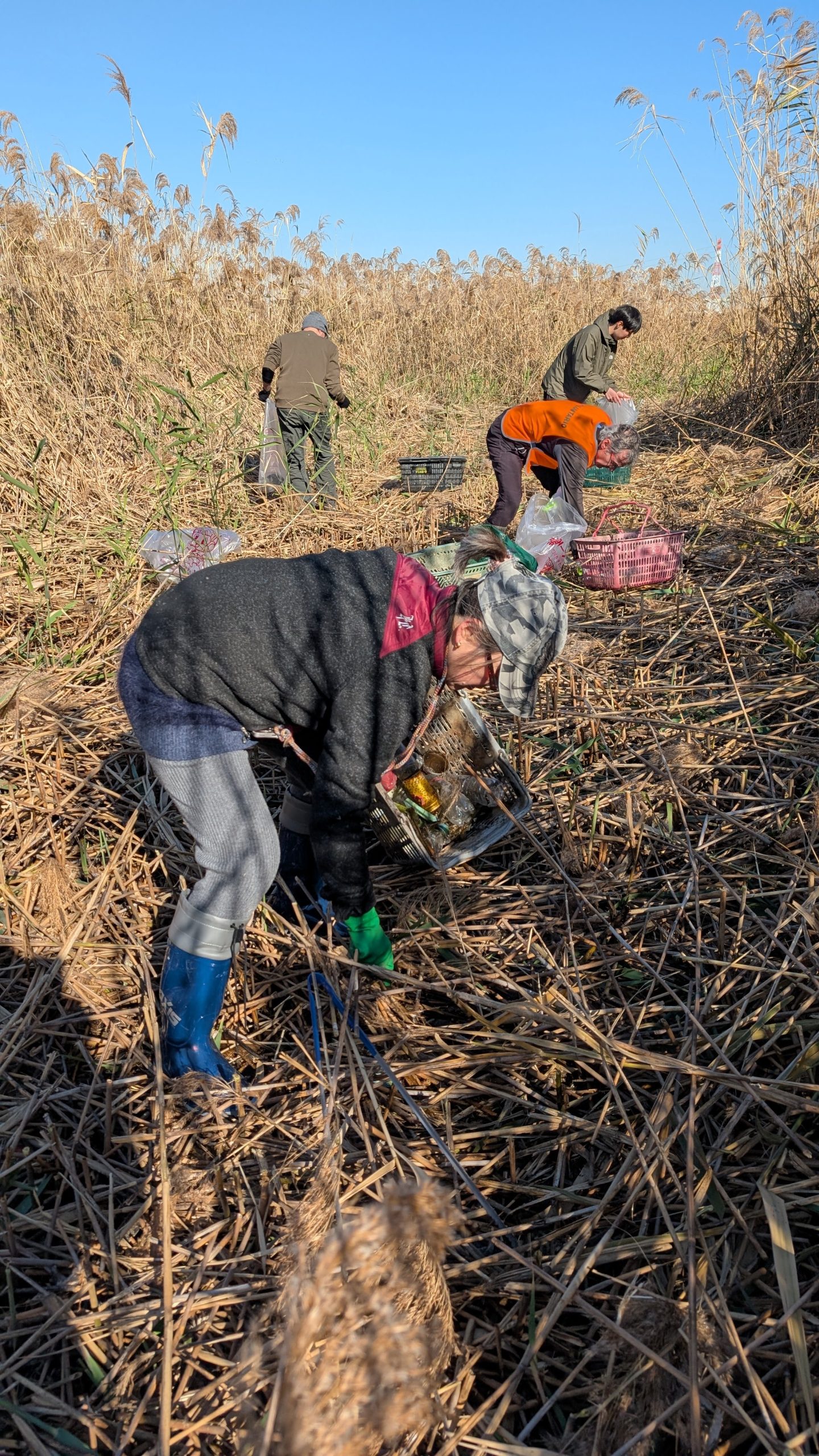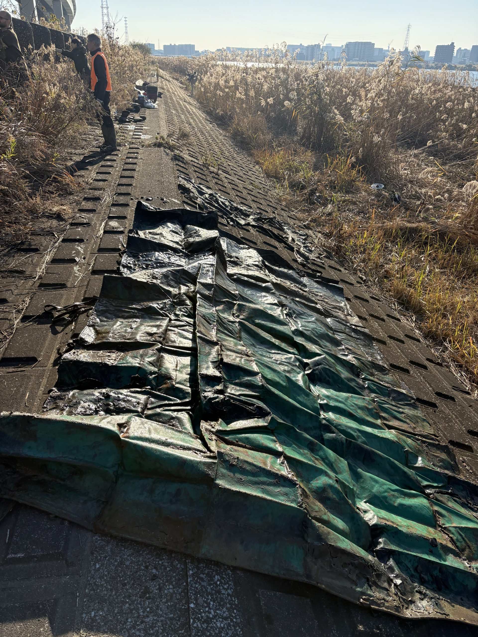 It was a big day on the Arakawa today with 11 volunteers collecting 58 bags of trash at Funabori. Again, it was great weather and a great effort by everyone to really collect a lot of trash. A couple, who organize a similar group in Spain, joined us today for a second time after joining about three years ago (wearing orange vests from their group). They also helped clean the dirty angle after the event finished which added about 14 bags to the total after the main group collected about 44 bags at the second pod section. Mina-san otsukaresama desu!