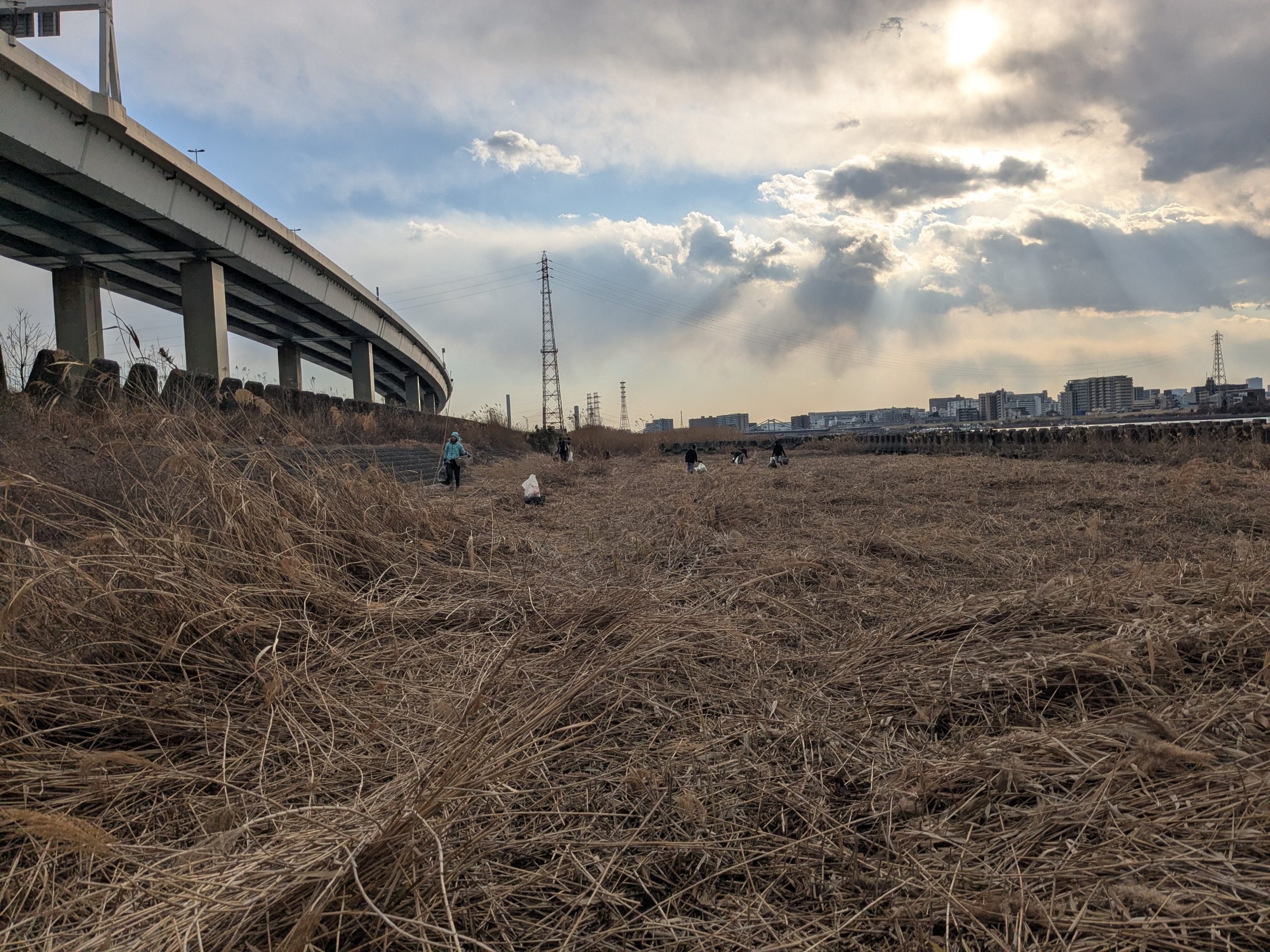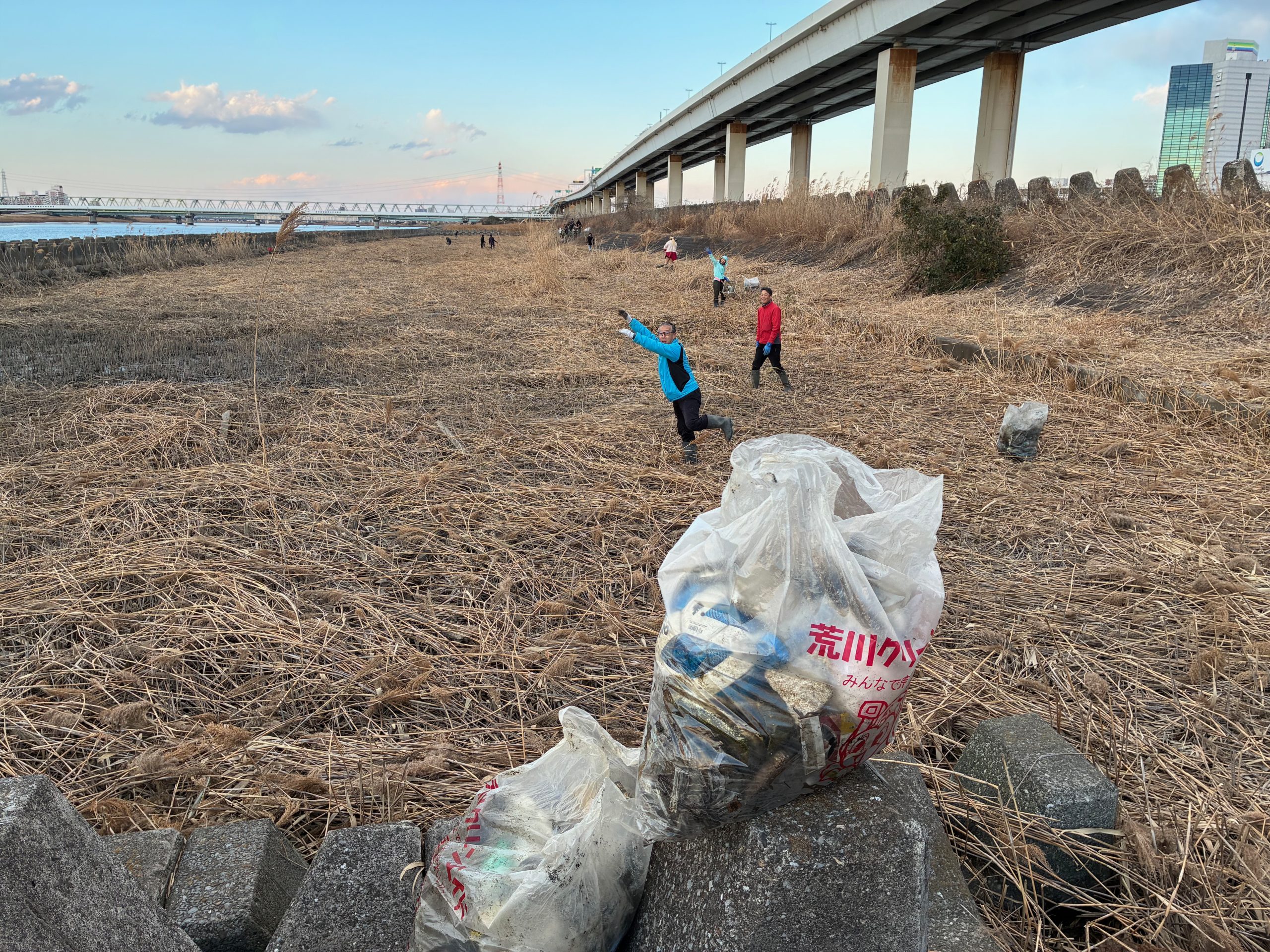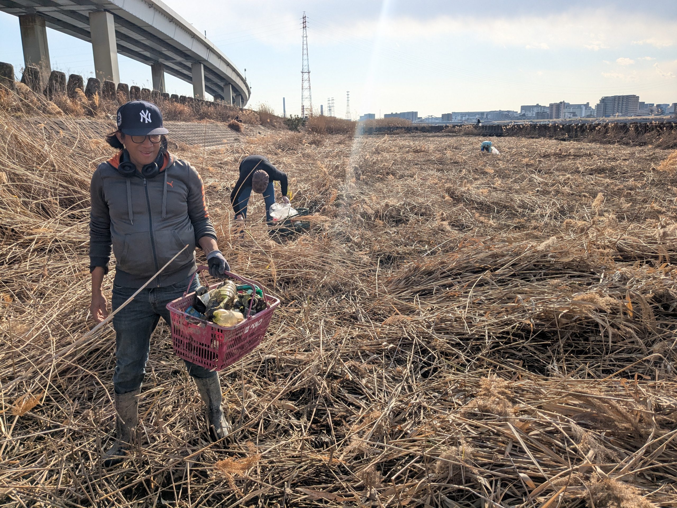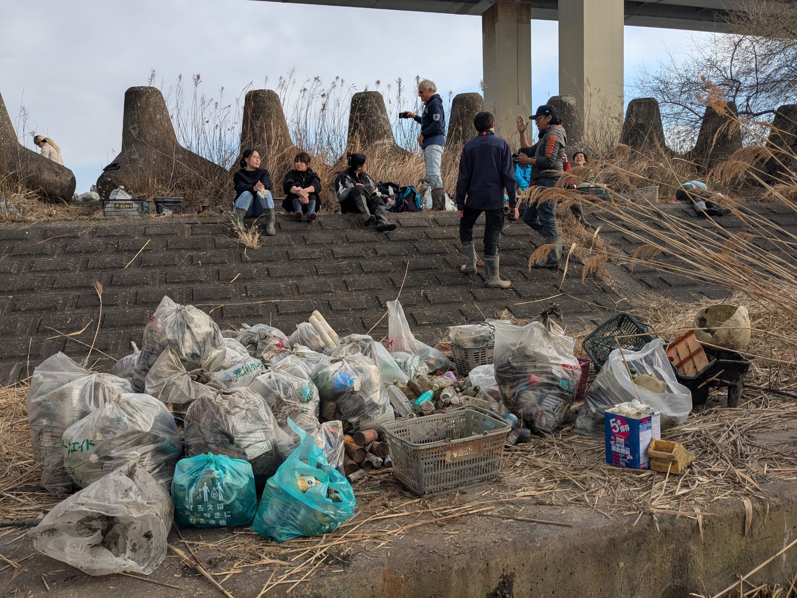 Eighteen volunteers collected 62 bags of trash at today’s Arakawa River clean up event. We reached a milestone by finishing the clearcutting of grass on the second section of pods along with another nice haul of gomi. But from here on our it should be diminishing returns on this area as we try to thoroughly clean it before the grass grows back at the end of April. Anyway, there was lots of hidden trash where the grass had been and a great effort by a large group today to collect such a large amount. Mina-san otsukaresama desu.