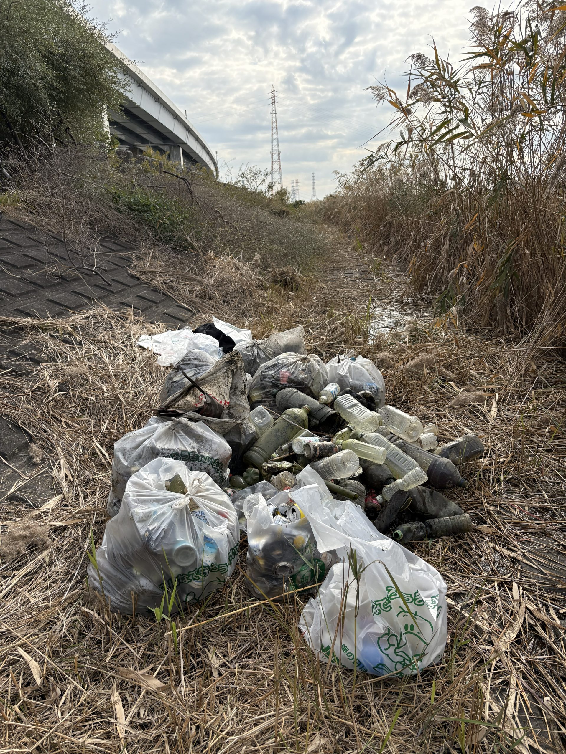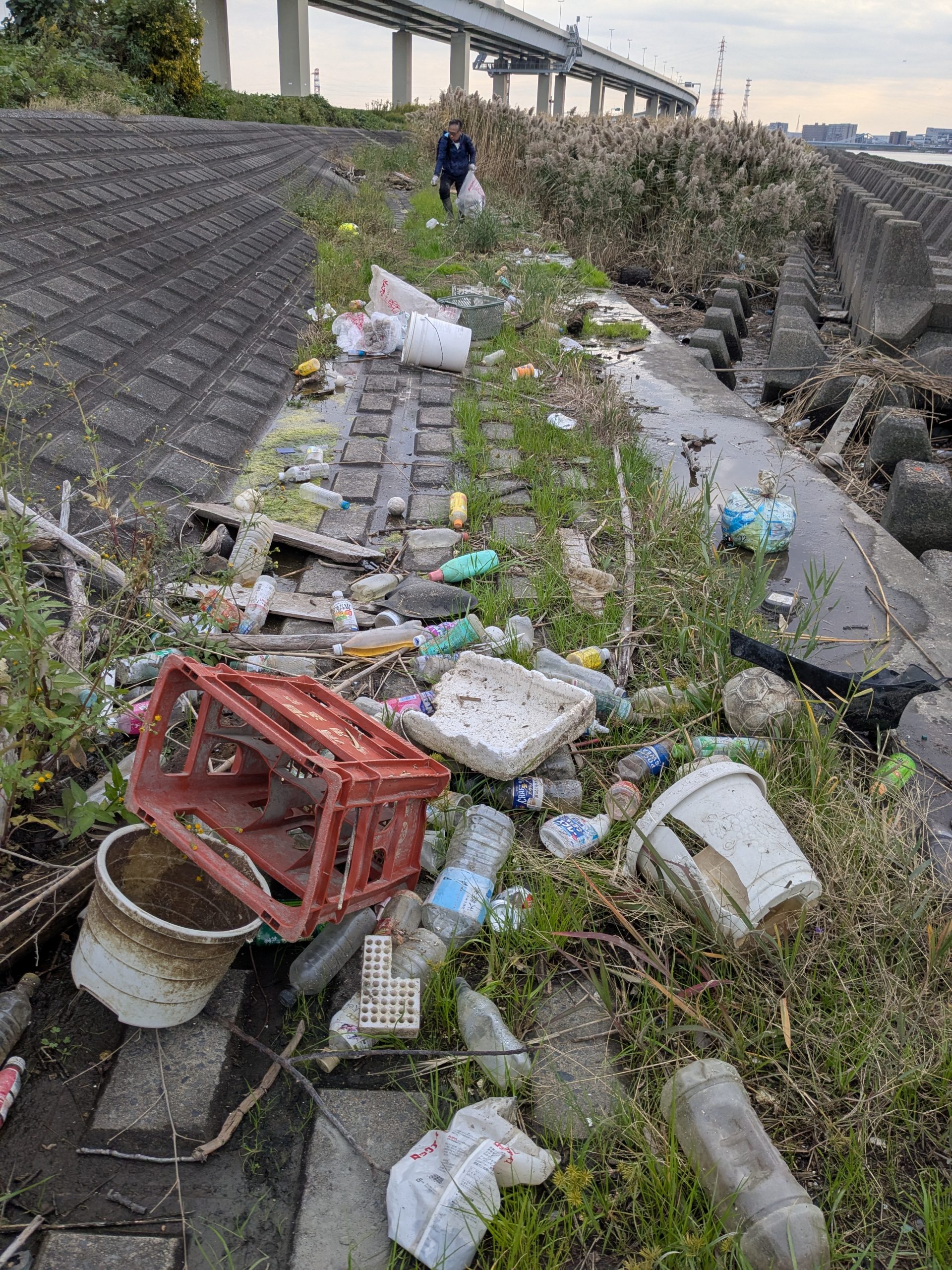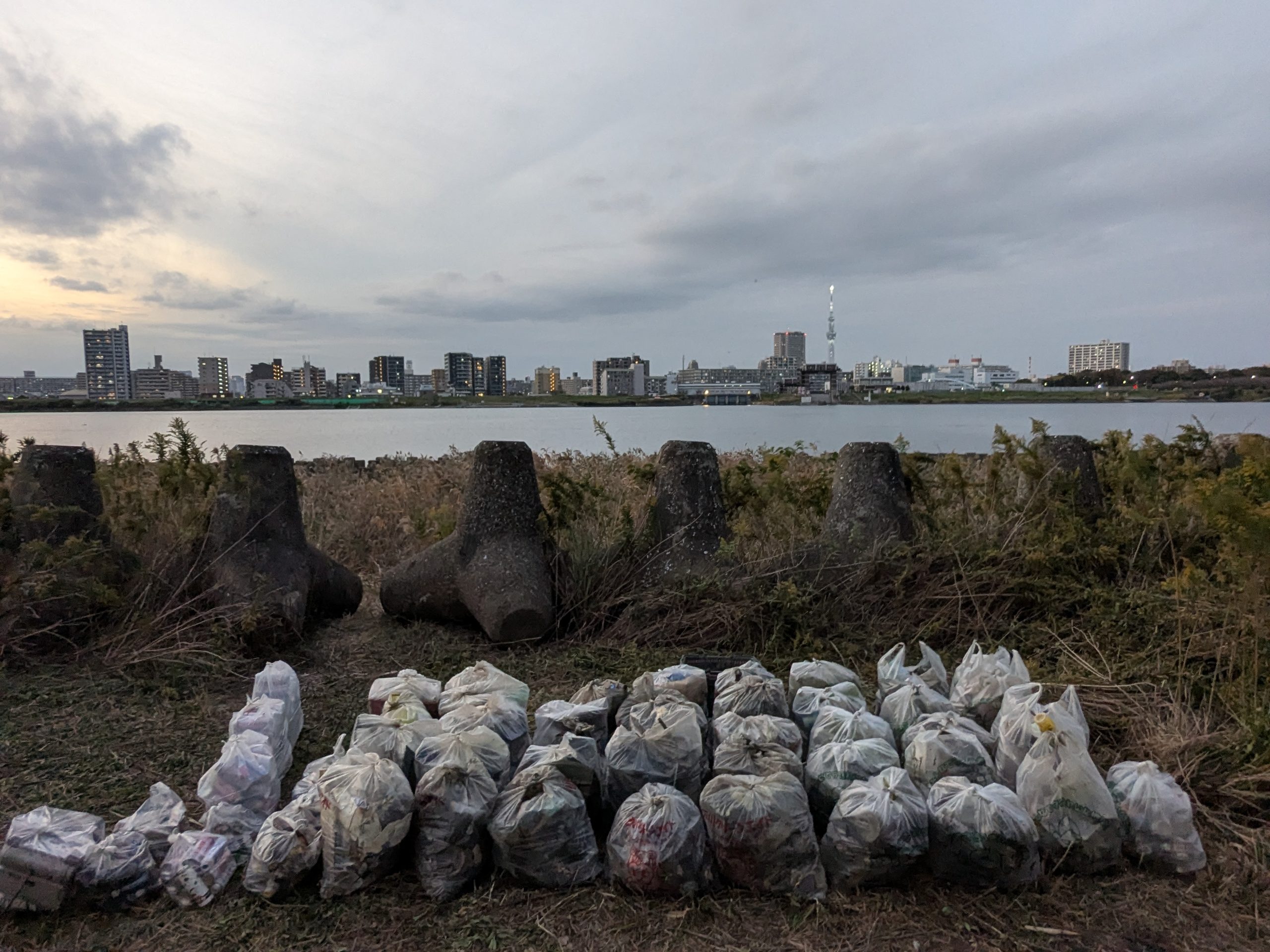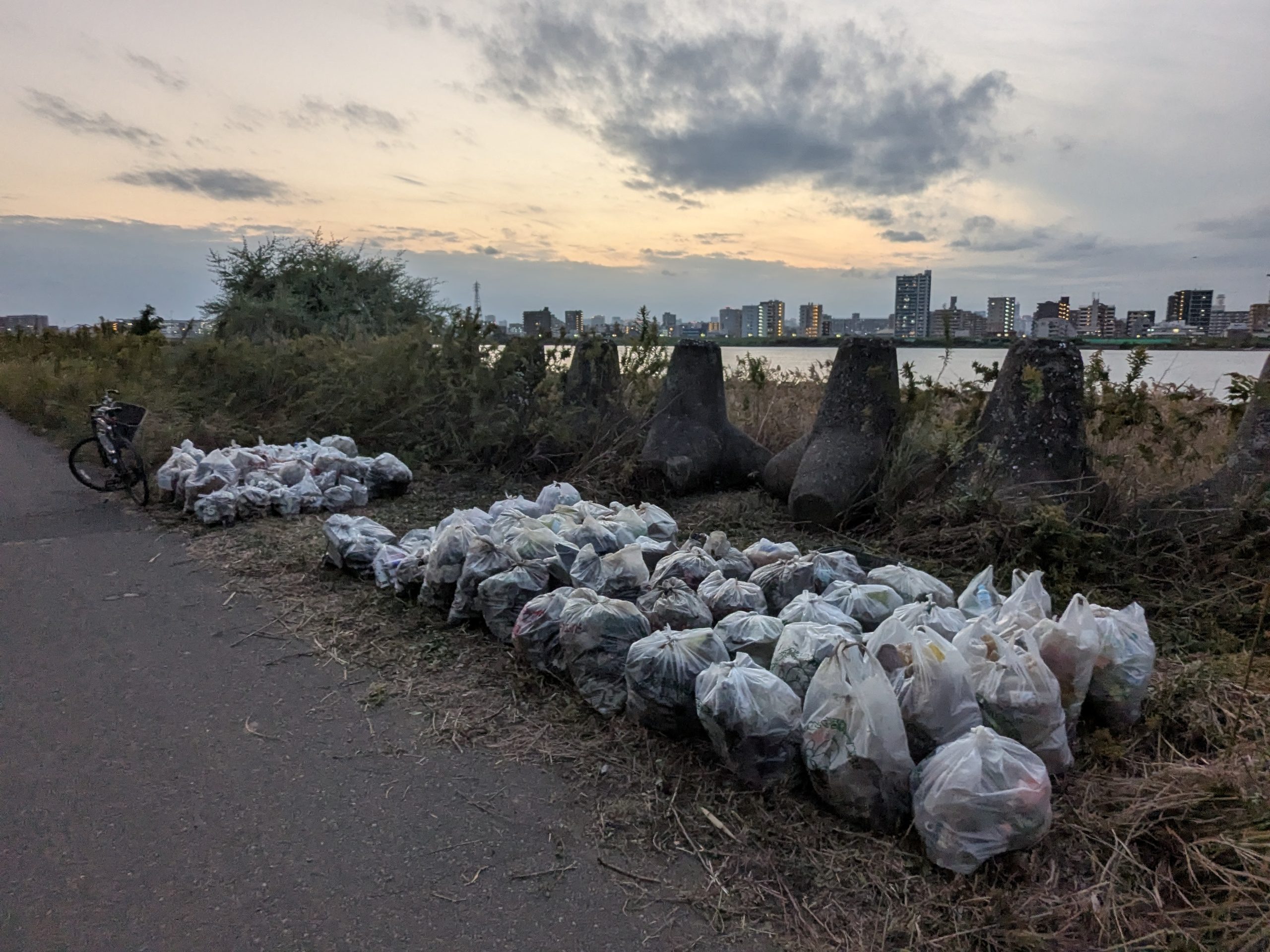 Eight volunteers collected 55 bags of trash at today’s Arakawa River clean up event. It was kind of two parts today with the group collecting 34 bags at our target area and then Suebayashi-san, who came late and still had some energy joined me to clean the dirty angle, which was again quite dirty, filling up with trash weekly and even daily. We were able to take 21 bags from there including some bags left by a homeless man. We did the sorting so we’ll count those 8 bags or so. The tide had come up at the Dirty Angle and my feet were already wet, so I just waded in. Then a few more bags were added to the final photo or 55 total for today. In the final photo you can see the 35 bags from the previous week or 90 bags over the 2 week-period. Mina-san otsukaresama desu!