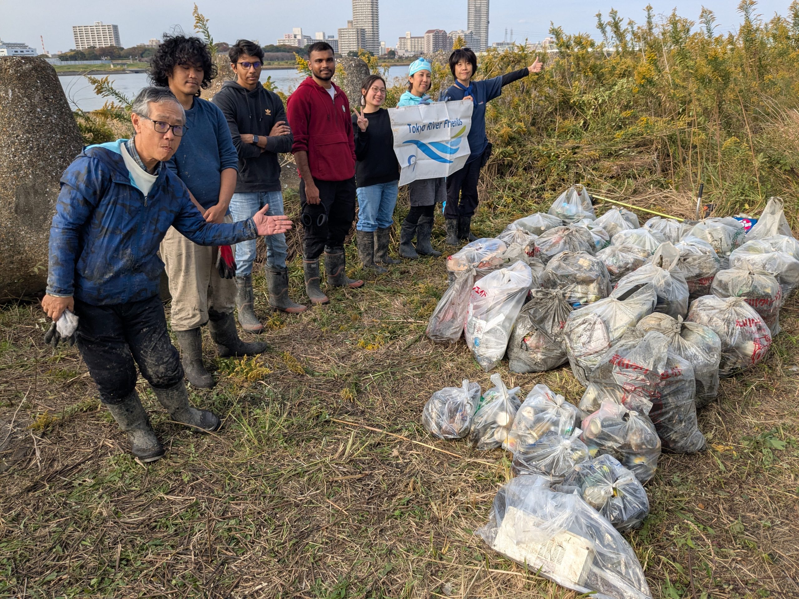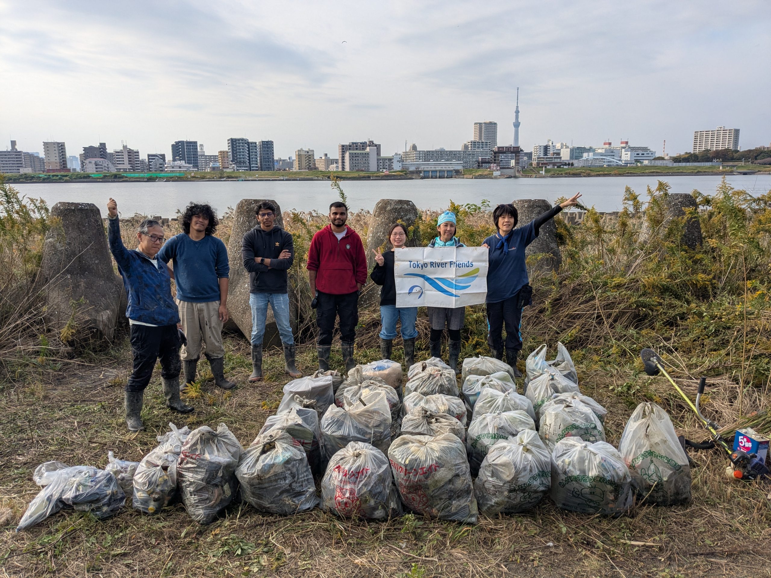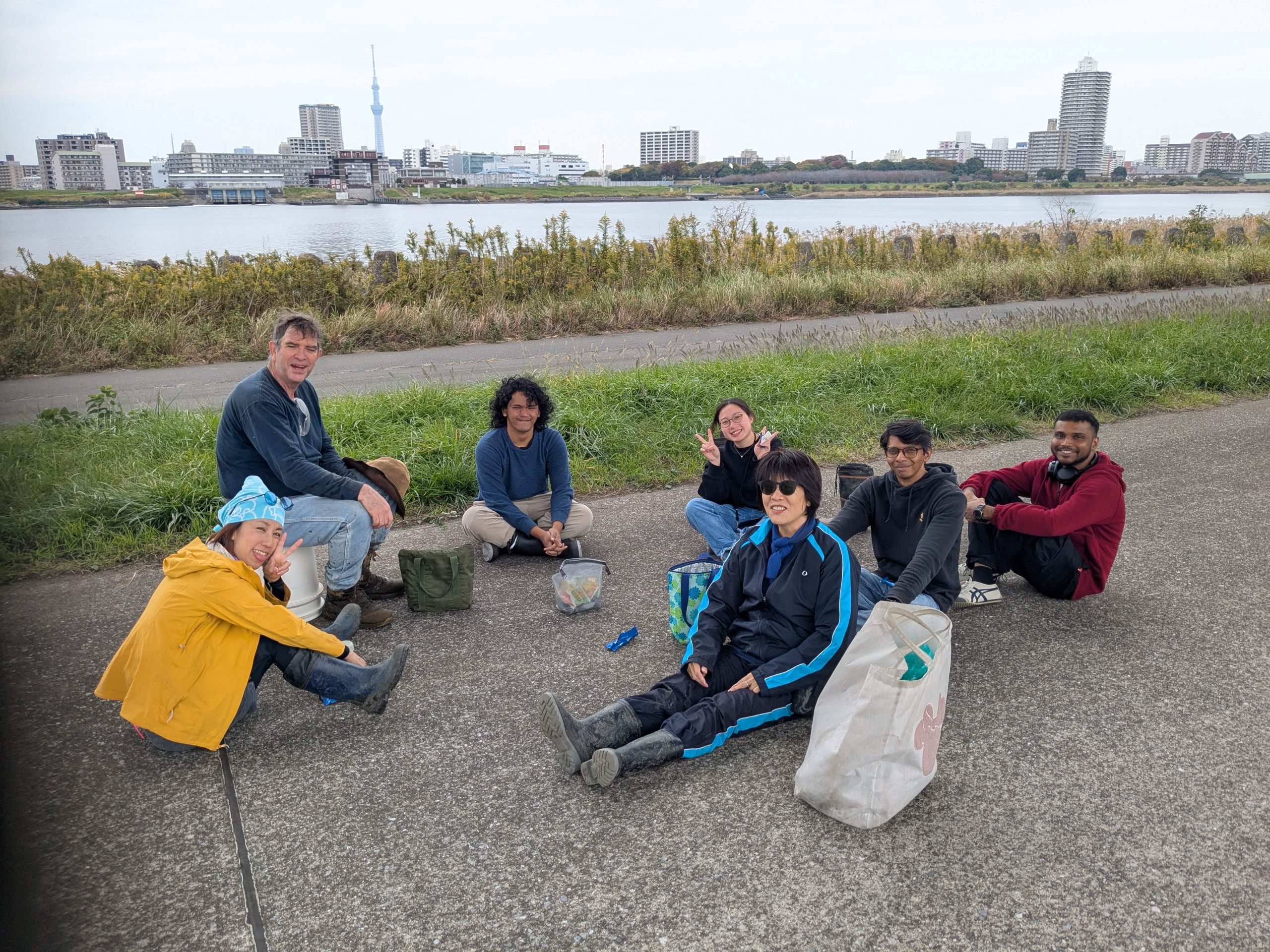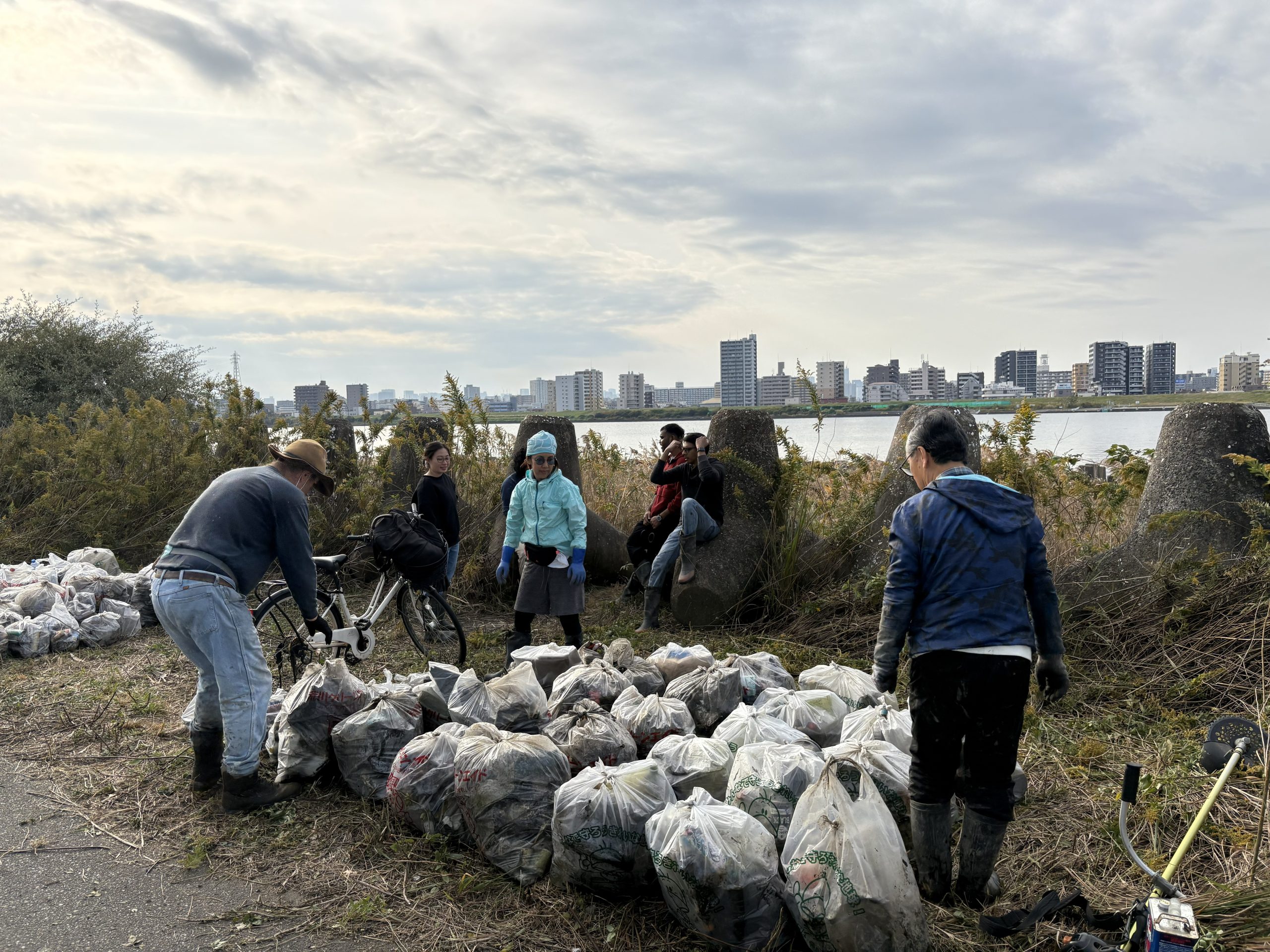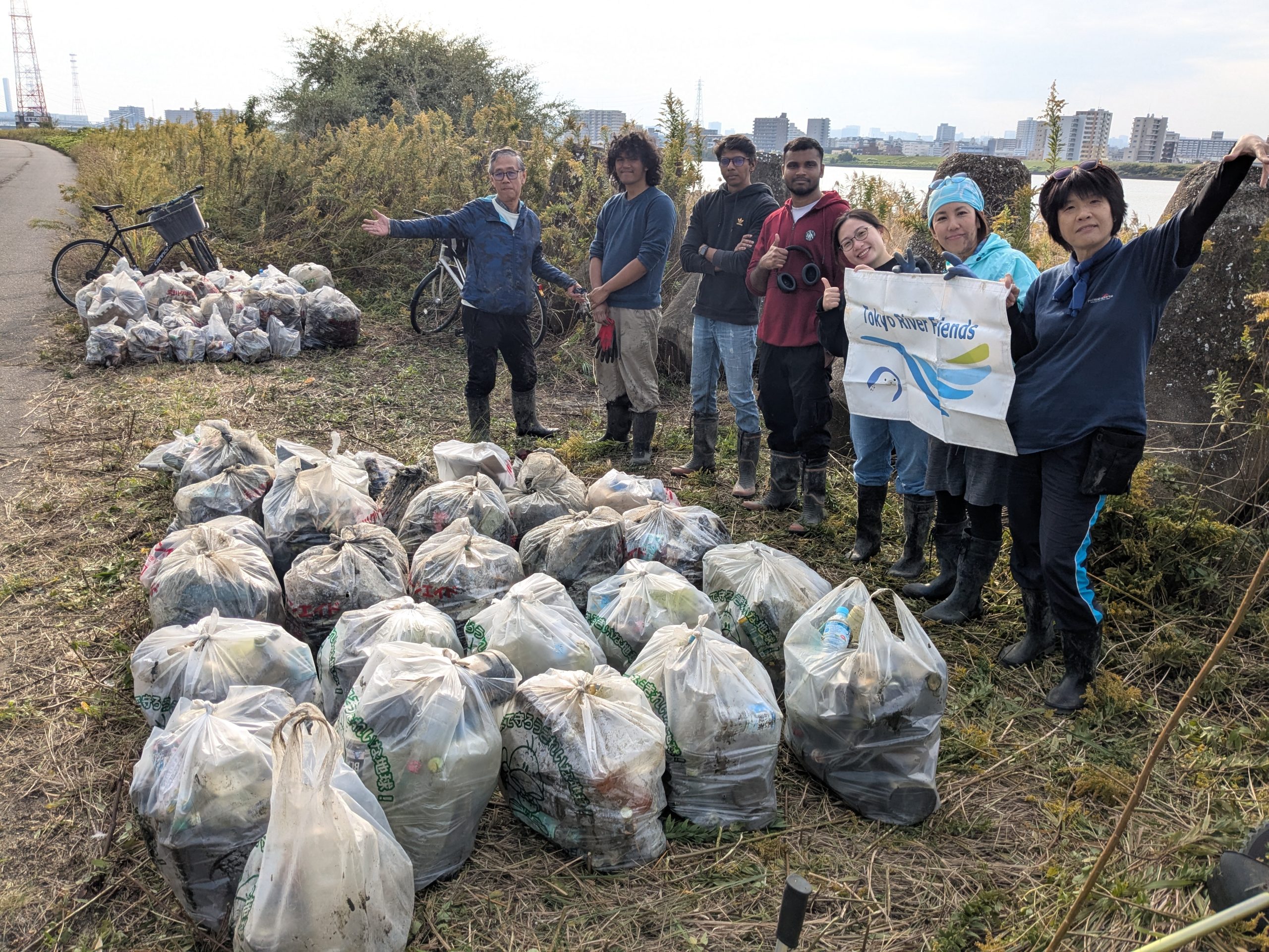 Eight volunteers collected 55 bags of trash at today’s Arakawa River clean up event. It was kind of two parts today with the group collecting 34 bags at our target area and then Suebayashi-san, who came late and still had some energy joined me to clean the dirty angle, which was again quite dirty, filling up with trash weekly and even daily. We were able to take 21 bags from there including some bags left by a homeless man. We did the sorting so we’ll count those 8 bags or so. The tide had come up at the Dirty Angle and my feet were already wet, so I just waded in. Then a few more bags were added to the final photo or 55 total for today. In the final photo you can see the 35 bags from the previous week or 90 bags over the 2 week-period. Mina-san otsukaresama desu!