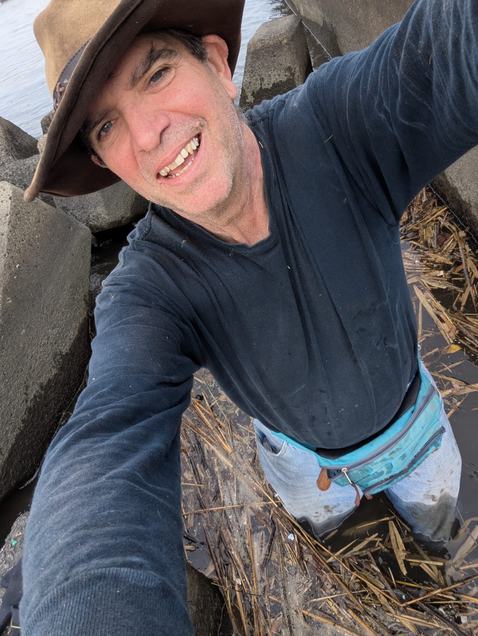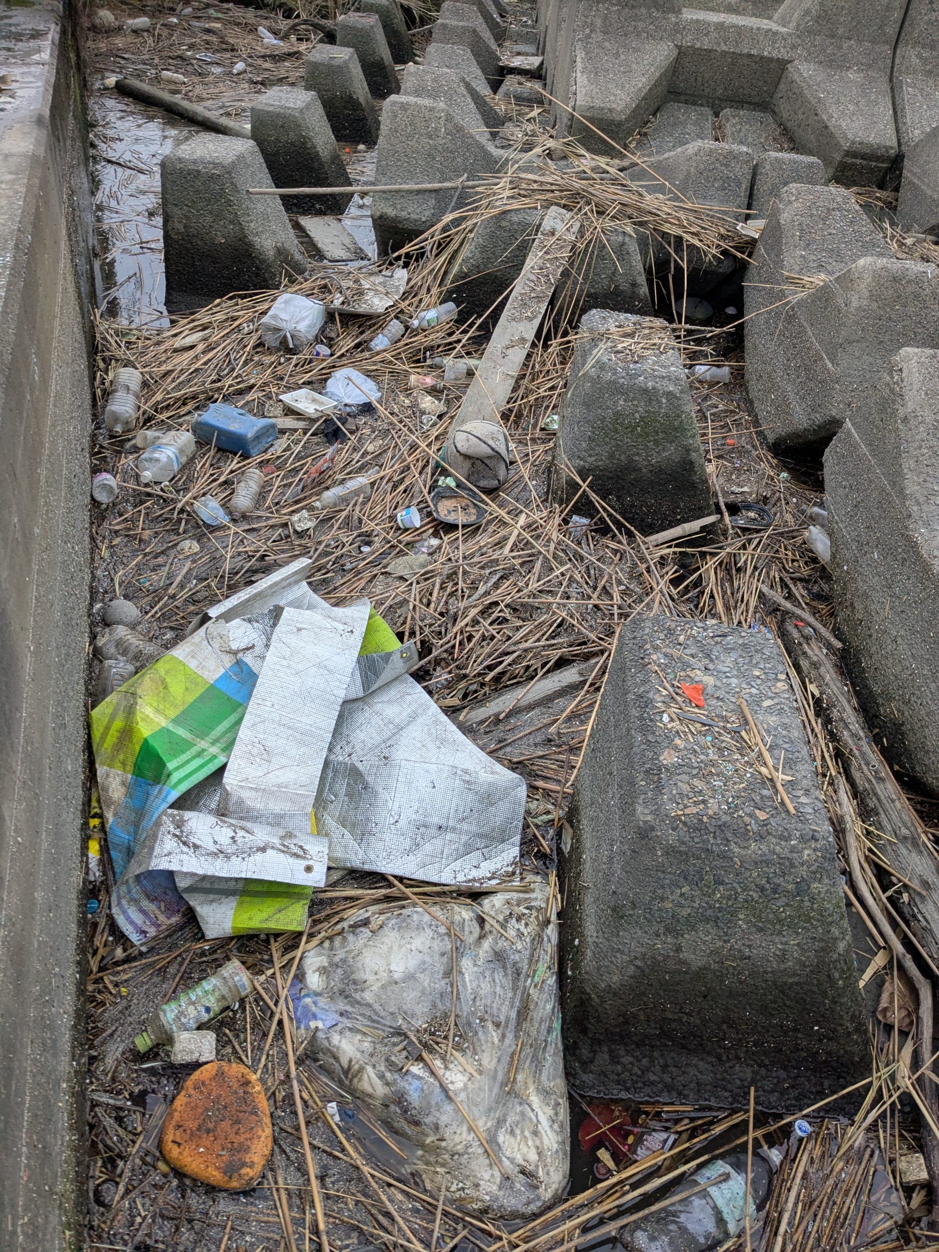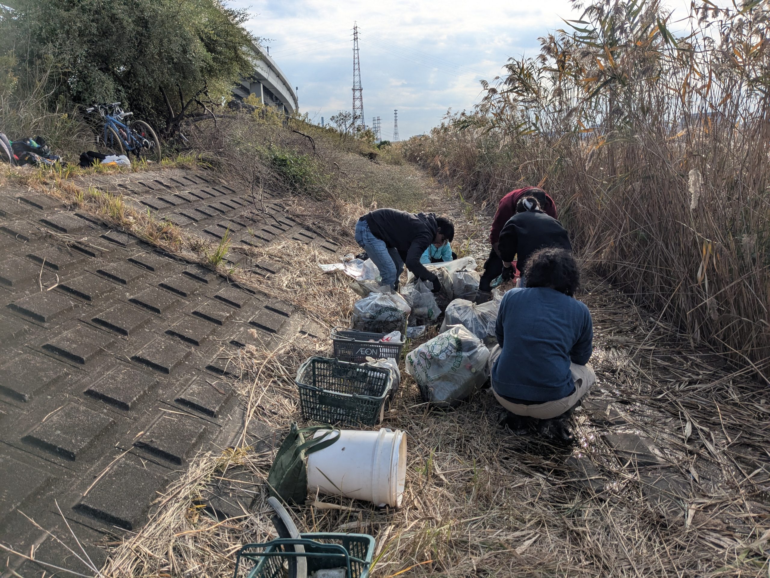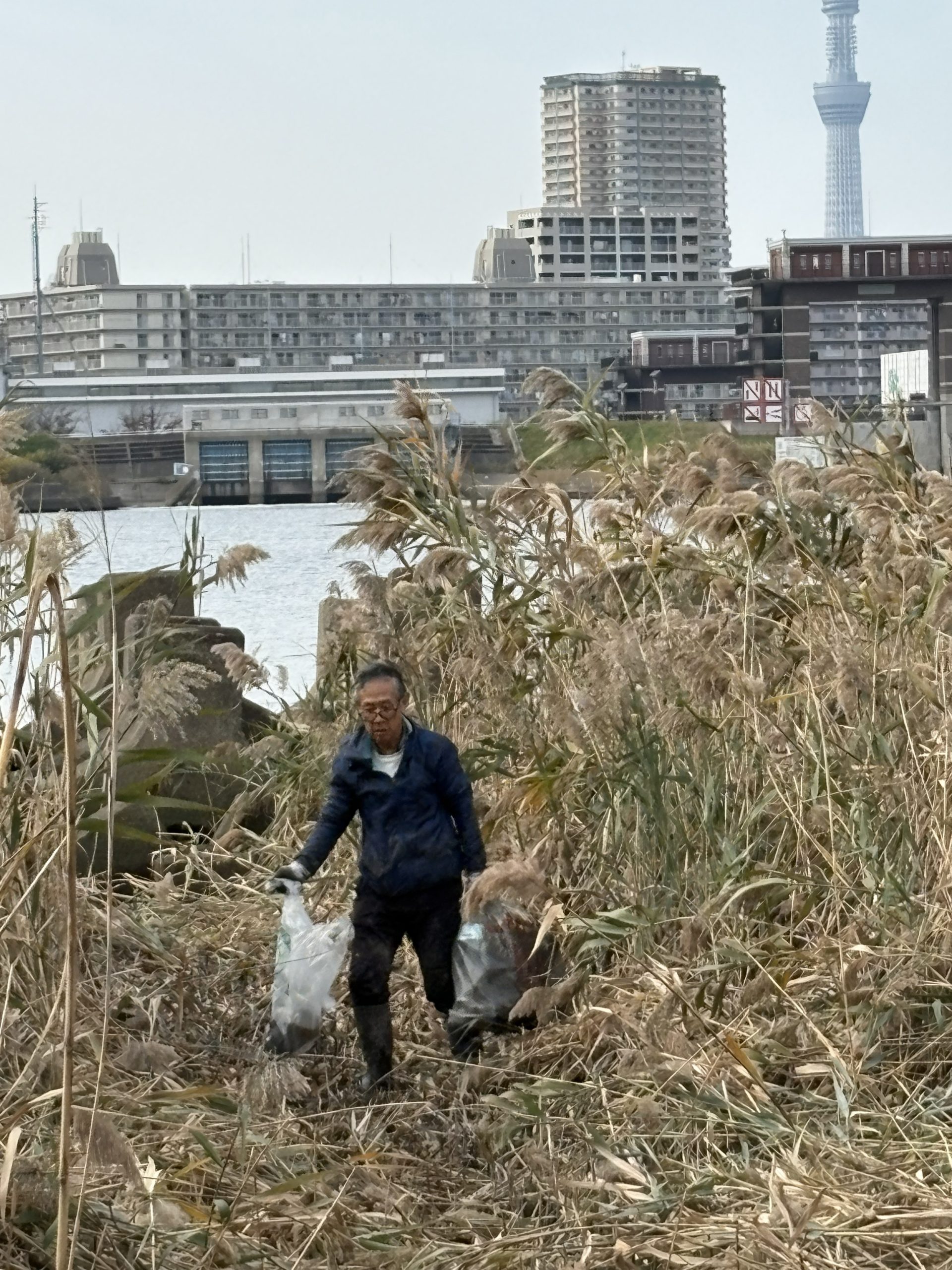 Eight volunteers collected 55 bags of trash at today’s Arakawa River clean up event. It was kind of two parts today with the group collecting 34 bags at our target area and then Suebayashi-san, who came late and still had some energy joined me to clean the dirty angle, which was again quite dirty, filling up with trash weekly and even daily. We were able to take 21 bags from there including some bags left by a homeless man. We did the sorting so we’ll count those 8 bags or so. The tide had come up at the Dirty Angle and my feet were already wet, so I just waded in. Then a few more bags were added to the final photo or 55 total for today. In the final photo you can see the 35 bags from the previous week or 90 bags over the 2 week-period. Mina-san otsukaresama desu!