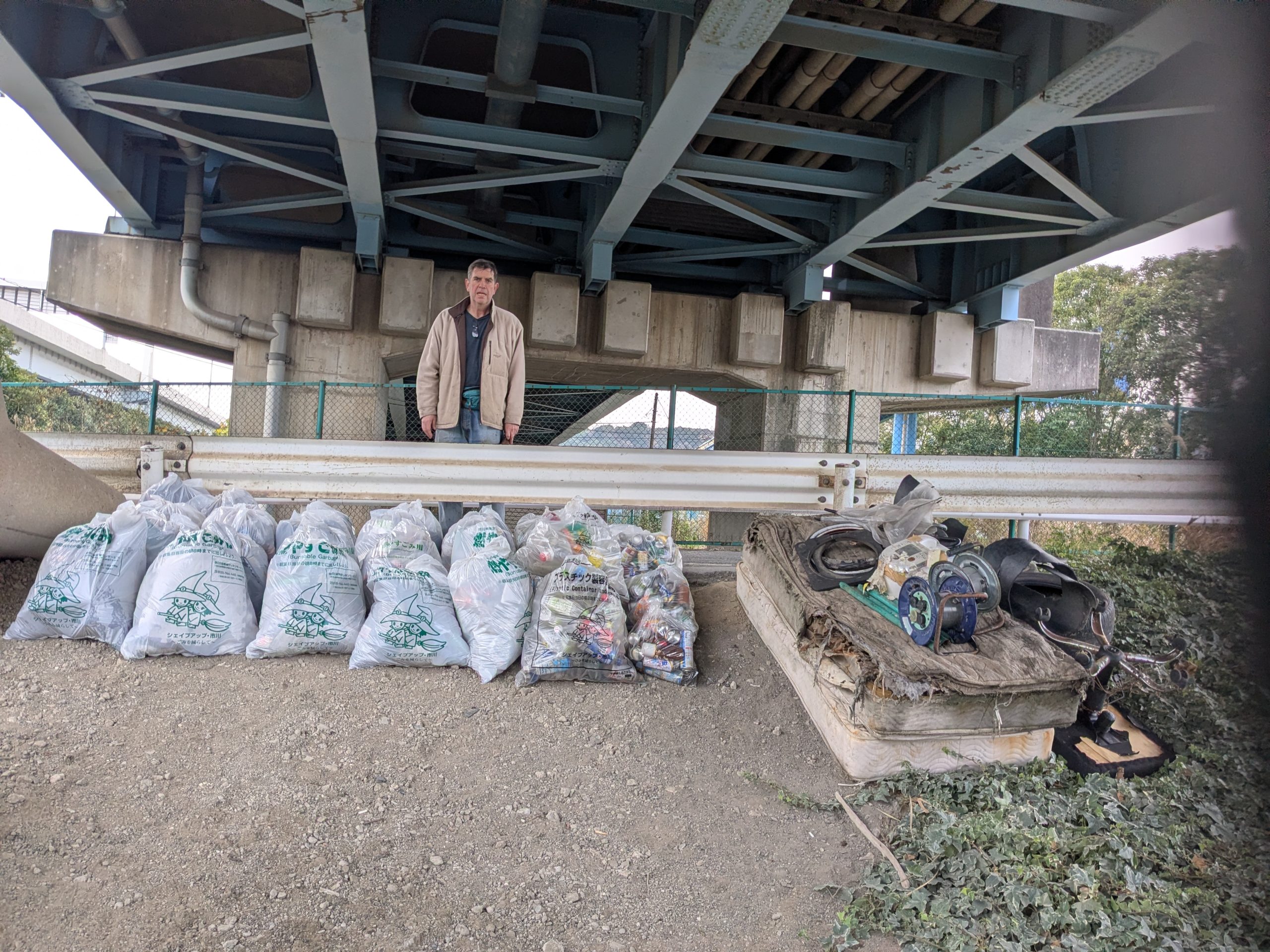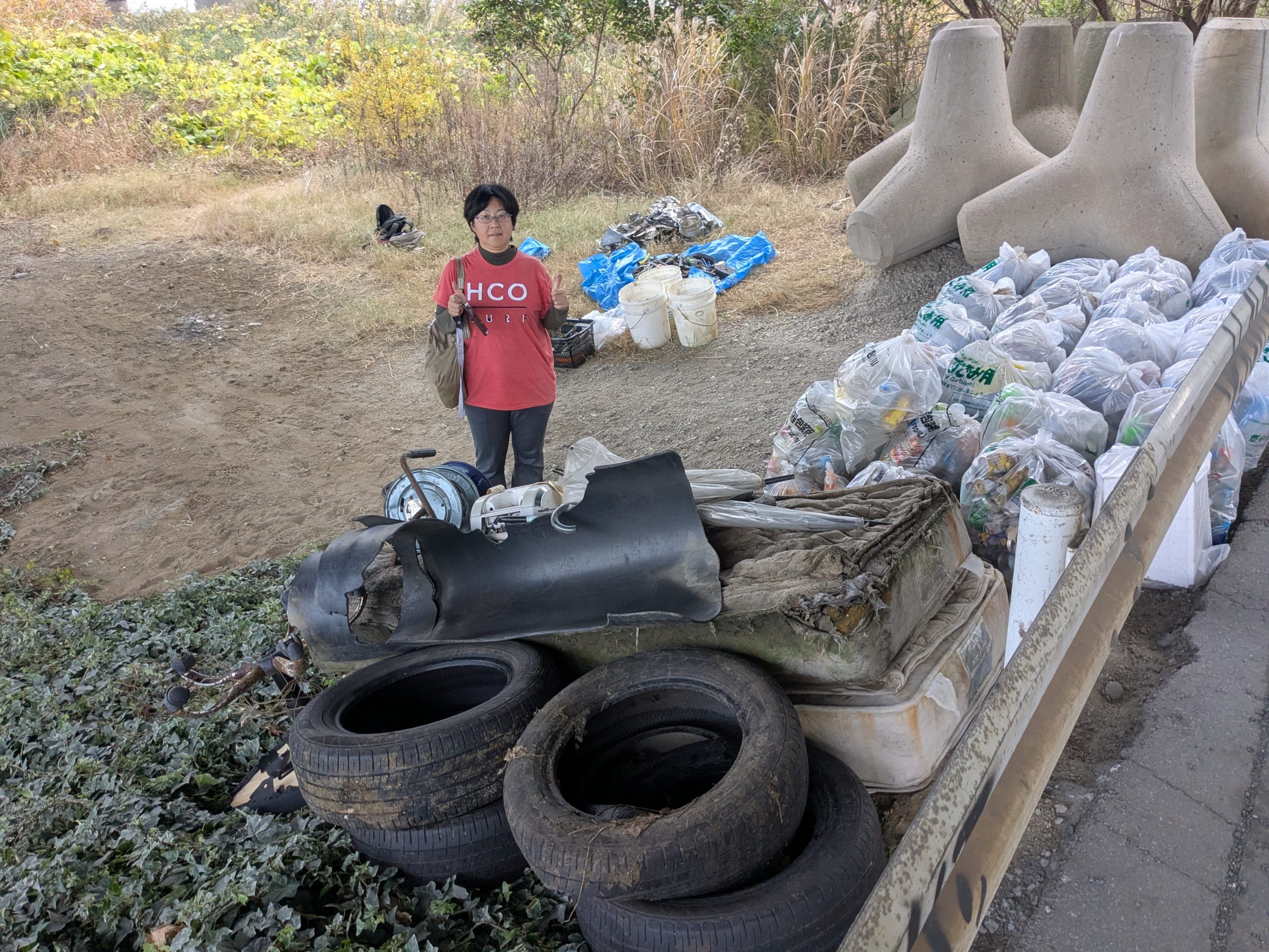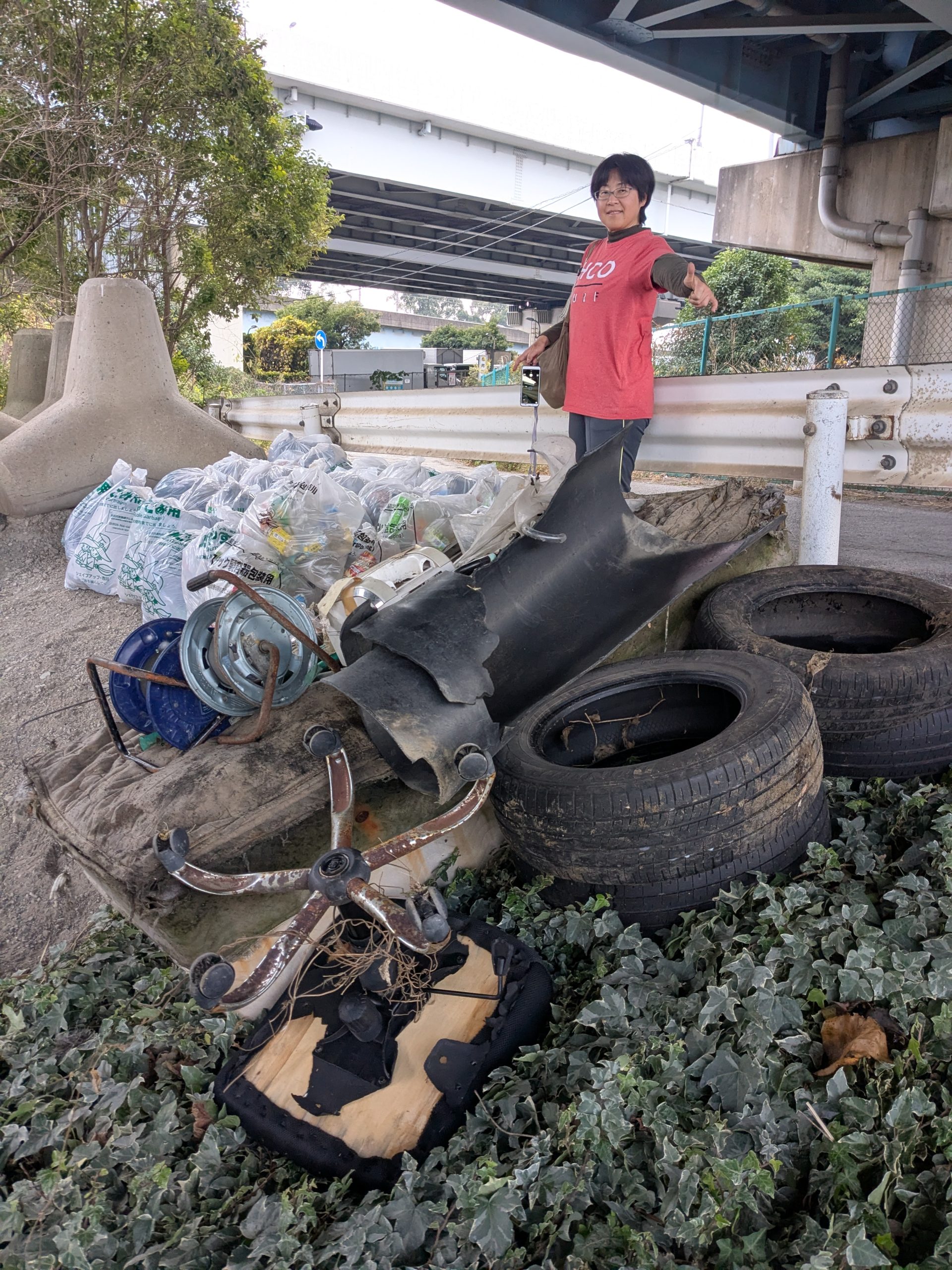 TRF strikes again! Three volunteers collected 68 bags of trash at today’s Edogawa River clean up event. (38 actual bags, roughly 25 bags equivalent for the large items and 5 buckets of scrap metal). TRF has 6 event leaders and 3 of them were there today, so I guess we had the A-Team today. Today was also notable because it was the 2ND HIGHEST collection total among all events in 2025. We had been scheduled to clean the main river bank but it was raining when we started, so we moved to Plan B and cleaned under the bay front bridges, where there was quite a lot of trash.