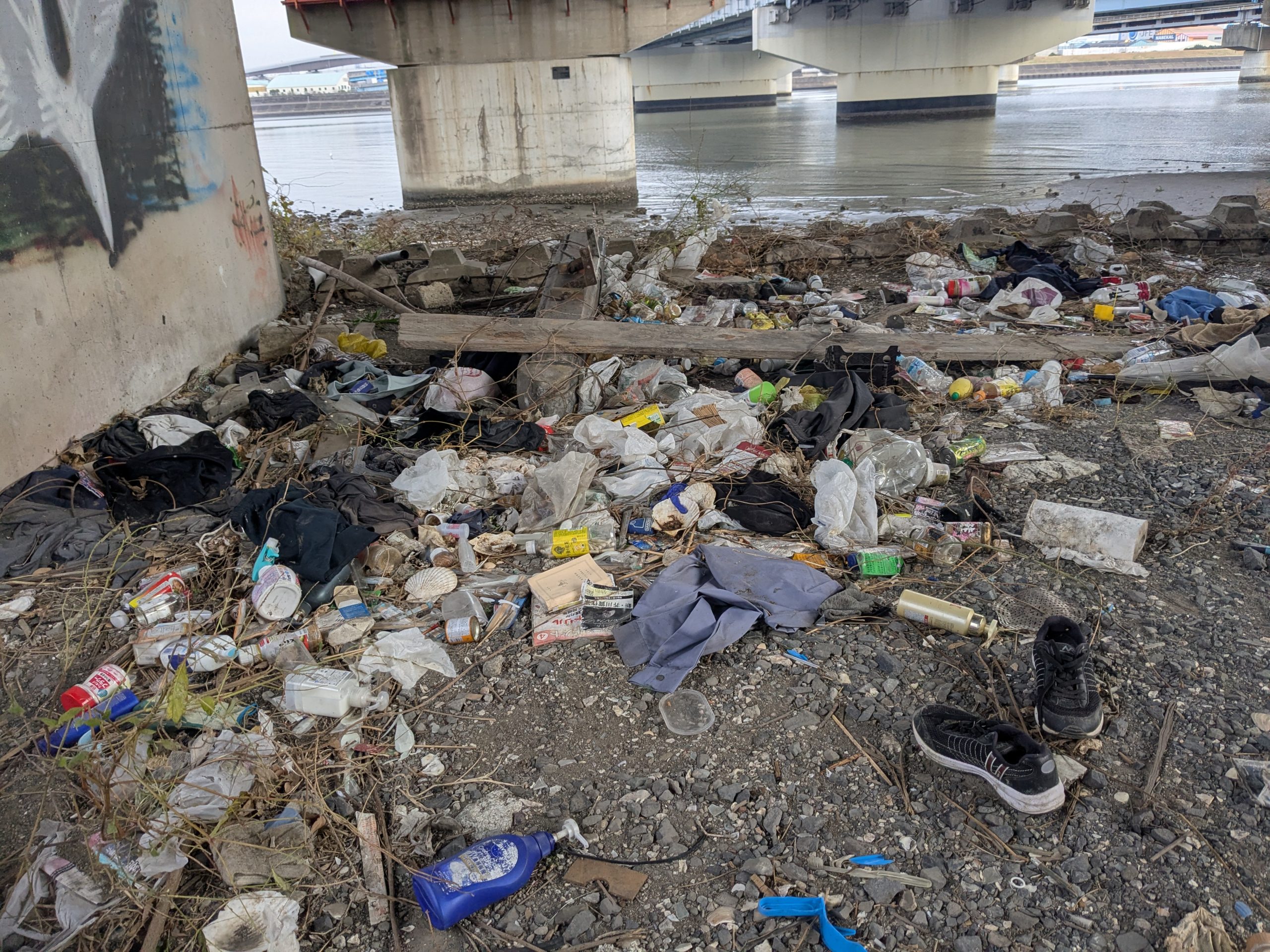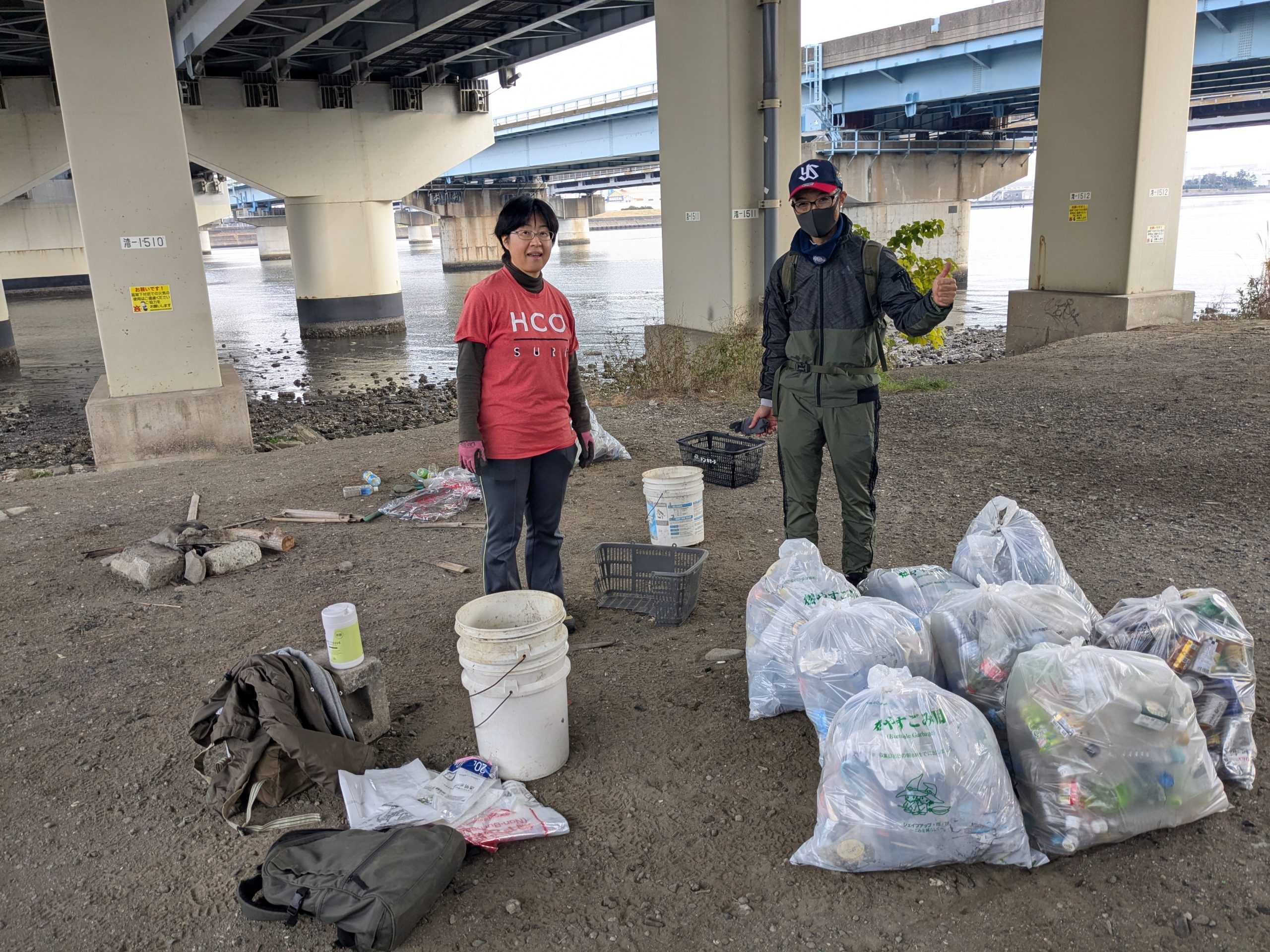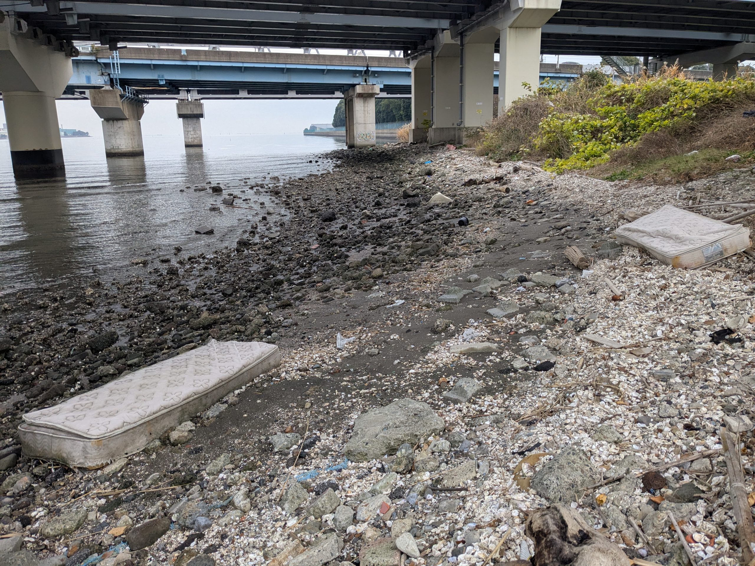 TRF strikes again! Three volunteers collected 68 bags of trash at today’s Edogawa River clean up event. (38 actual bags, roughly 25 bags equivalent for the large items and 5 buckets of scrap metal). TRF has 6 event leaders and 3 of them were there today, so I guess we had the A-Team today. Today was also notable because it was the 2ND HIGHEST collection total among all events in 2025. We had been scheduled to clean the main river bank but it was raining when we started, so we moved to Plan B and cleaned under the bay front bridges, where there was quite a lot of trash.