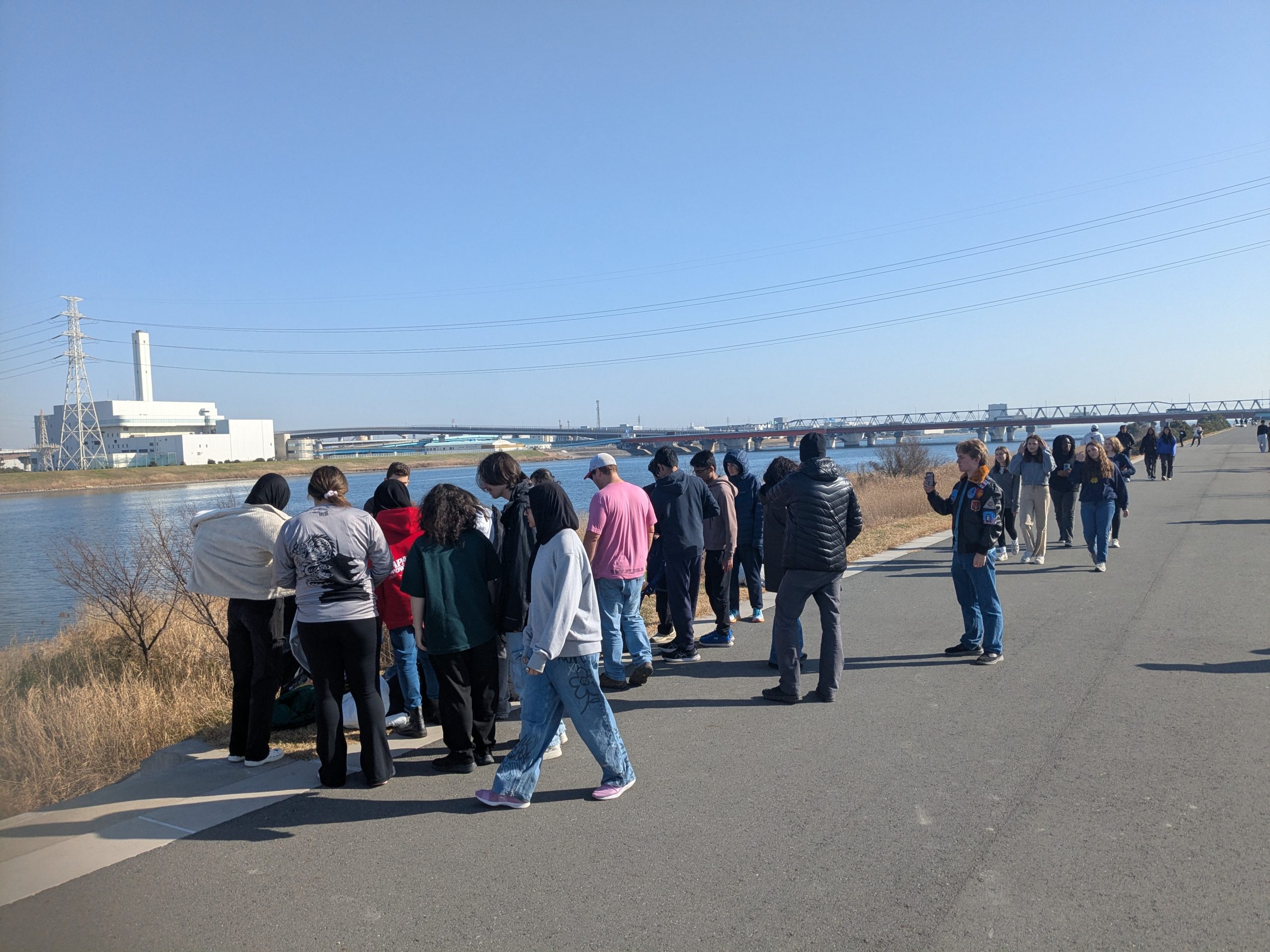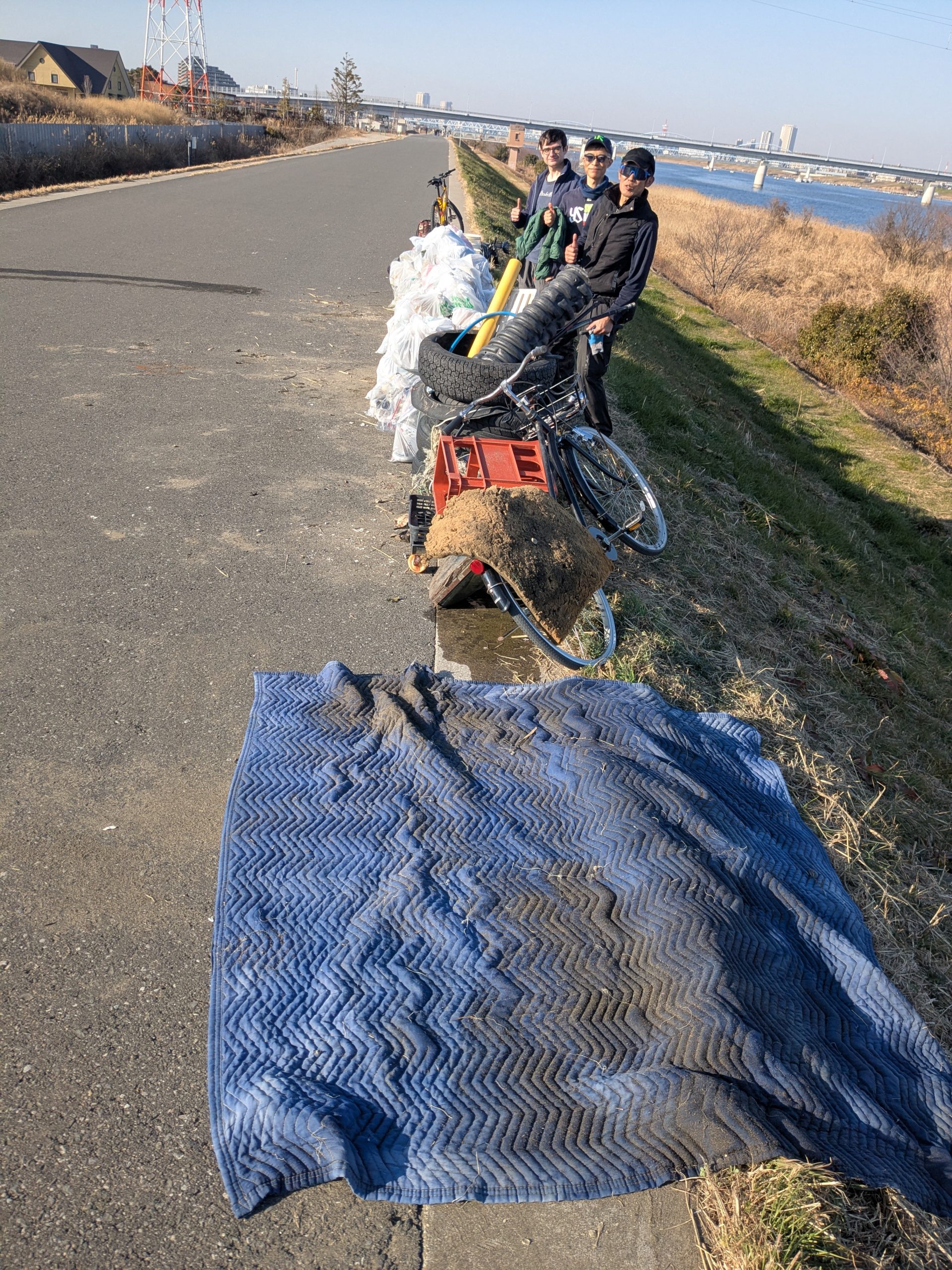 It was a big day on the Edogawa today with 36 volunteers collecting 60 bags of trash (48 actual bags + equivalent of 12 bags for the large items). Not all the collected bags and sodai gomi, which were spread out, had been moved into place during the main group photo. For the second year in a row TRF hosted a group of 31 students and administrators from the American School of Dammam in Saudi Arabia who were performing community service during a student trip to Japan. Together with 5 regular TRF members, the large group enabled us to spread out and clean the entire target area. I was surprised at the volume of trash that had accumulated their since our last cleaning of the area about 9 months ago. The weather was wonderful for January, and the students really made a great effort, which produced a large result. Mina-san otsukaresama desu!