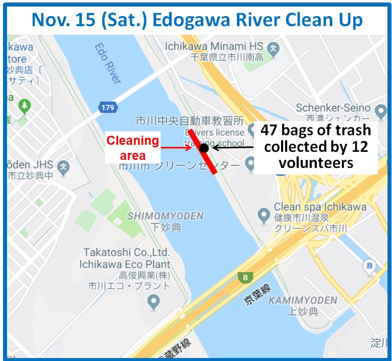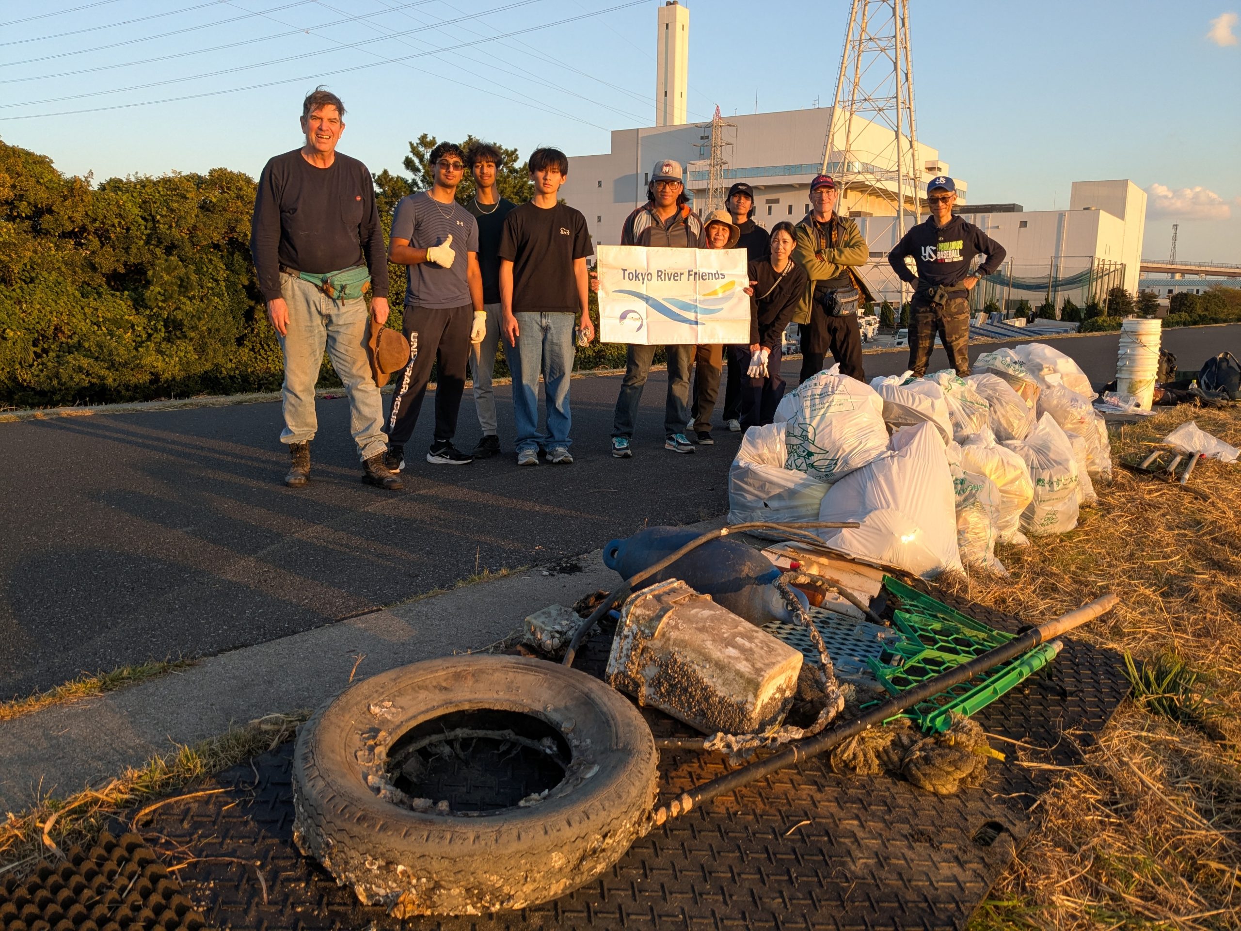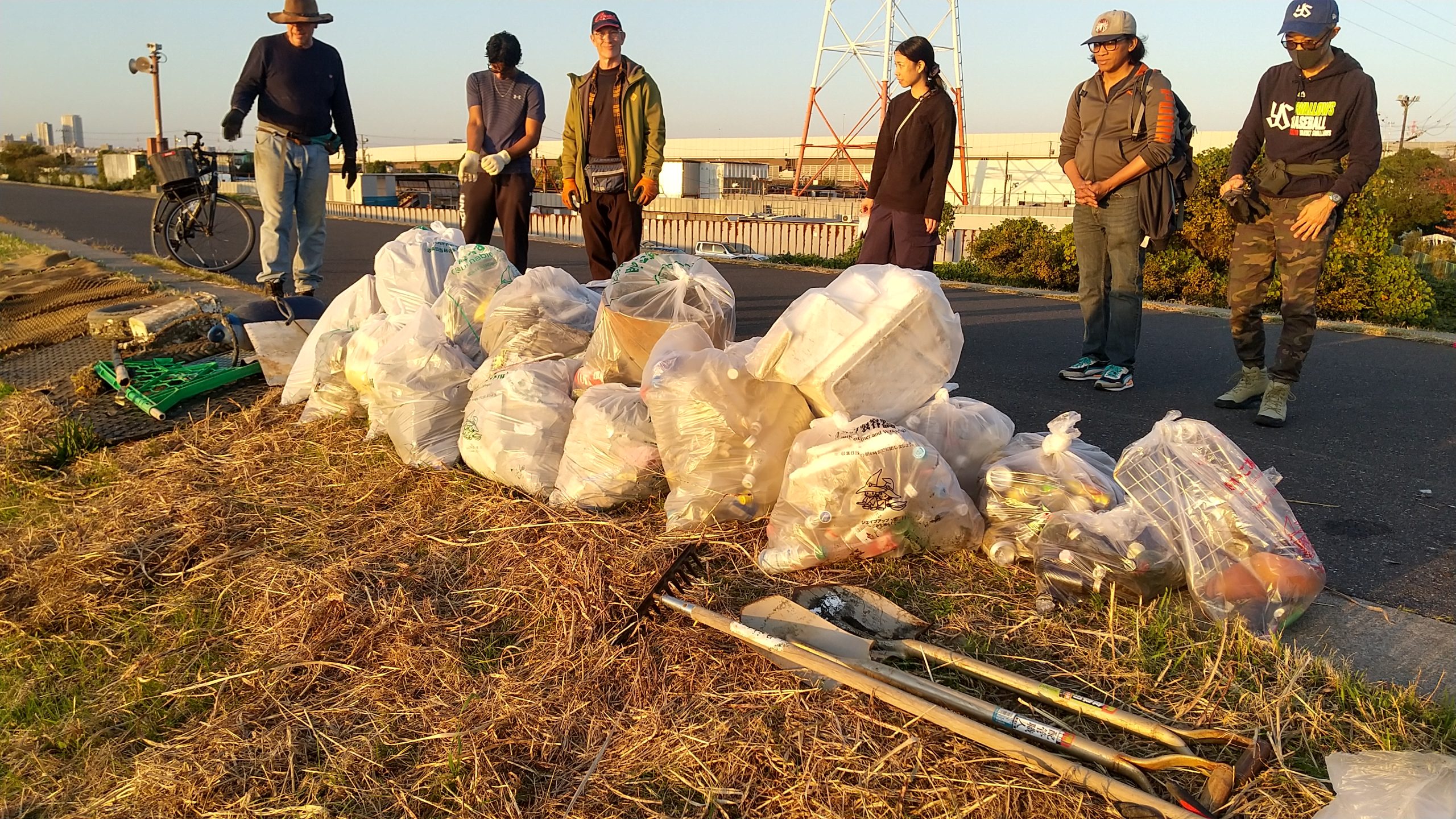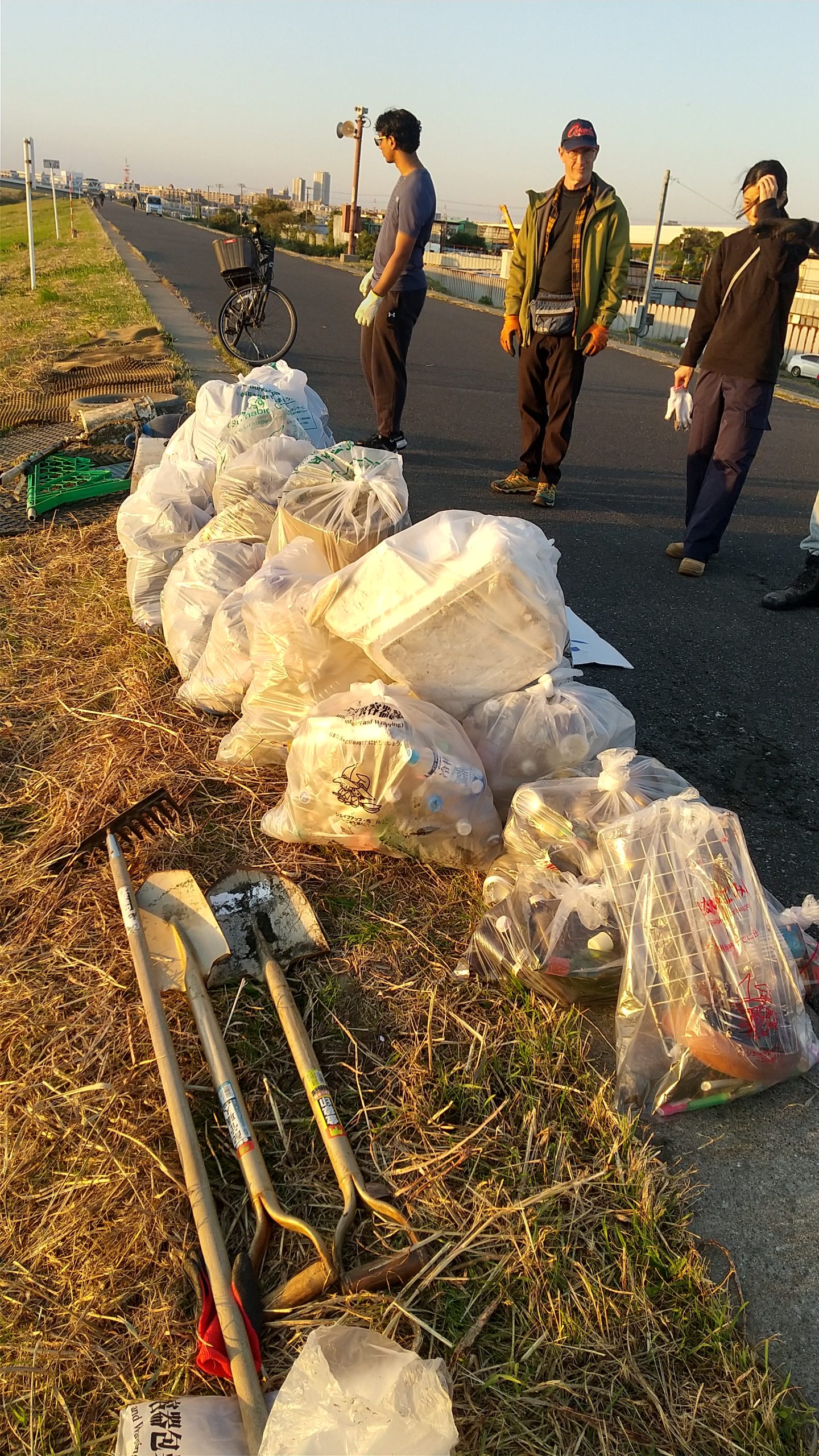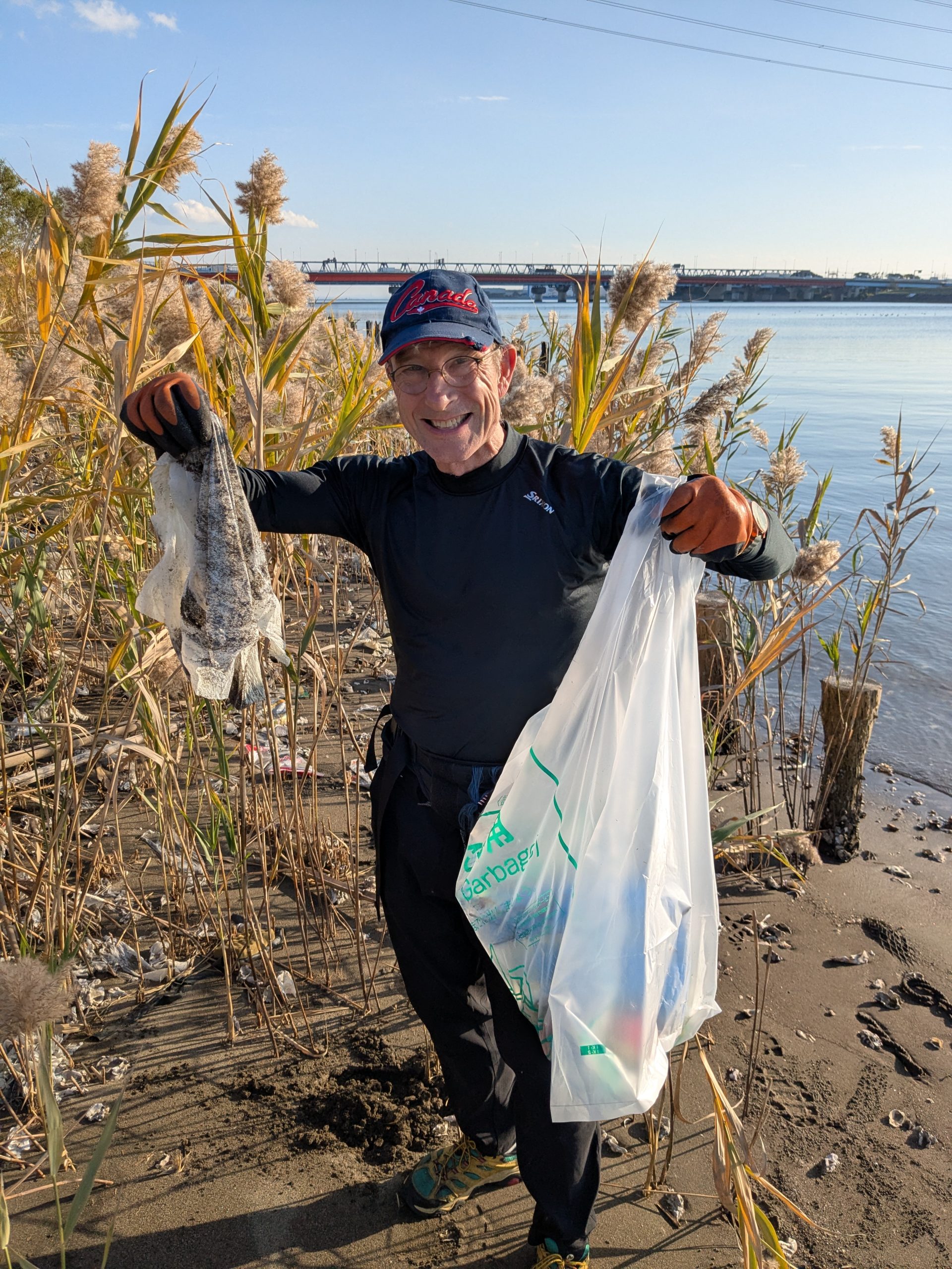Twelve volunteers collected 47 bags of trash at today’s Edogawa River clean up event (27 actual bags + roughly equivalent of 20 bags for the large unbagged items). It was beautiful near perfect weather + plus a large turnout + a couple of very dirty patches = a large collection today. An Ichikawa City Councilwoman, Ms. Kaori Fuke, joined our event today. Recently there had been some problems behind the scenes with the river office and the Ichikawa City trash office wanting to stop collections from out events, but Ms. Fuke contacted Chiba prefectural assemblyman, Mr. Kotaro Tanaka, representing the Ichikawa area and he swiftly convened a meeting with a secretary for a member of parliament, Ms. Eri Arfiya and the river office. The problem was quickly resolved and trash collections have resumed. I was very surprised at how responsive area politicians were to the TRF request for assistance and cannot thank all of them enough for their invaluable support.