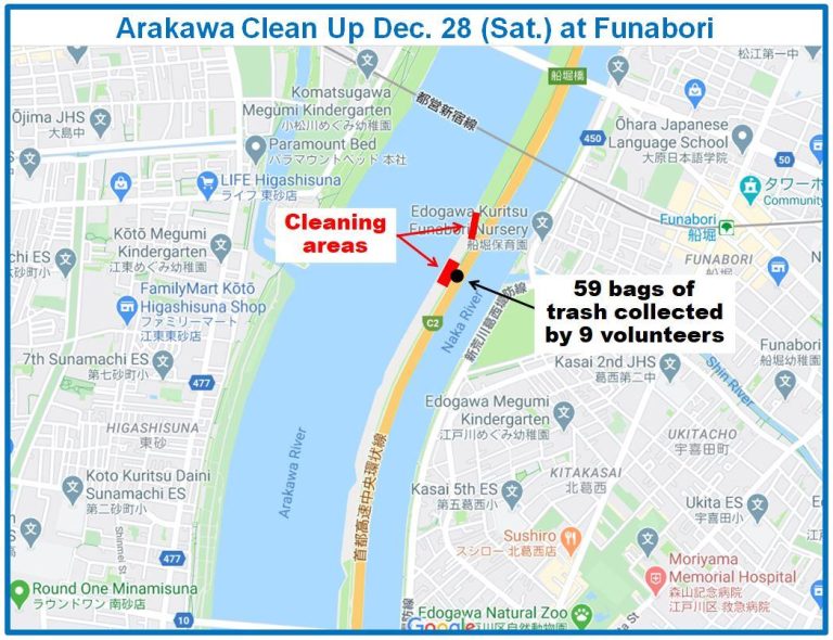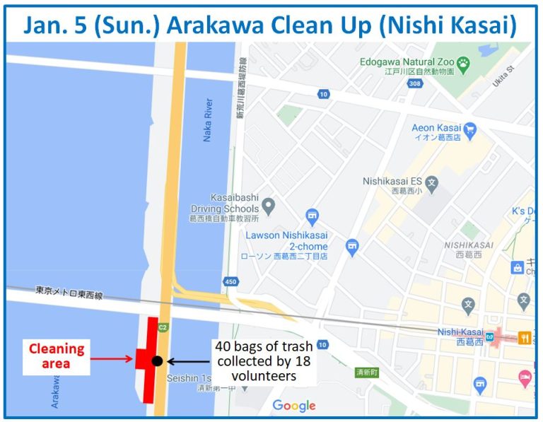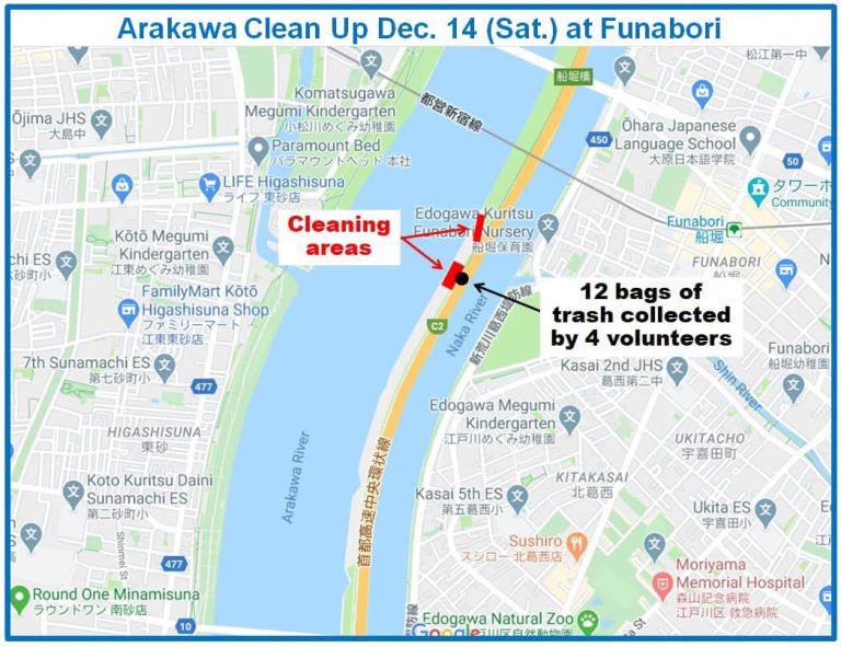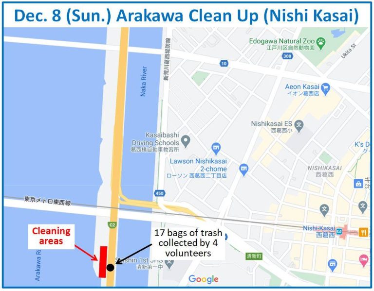 Four volunteers collected 17 bags of trash at today's Arakawa River clean up near Nishi Kasai. Once again, it was ...
