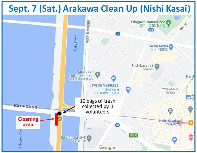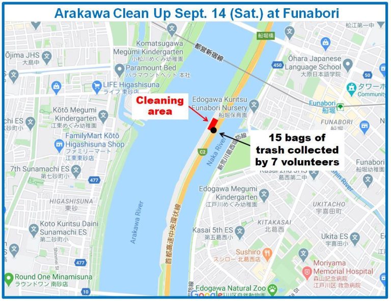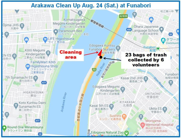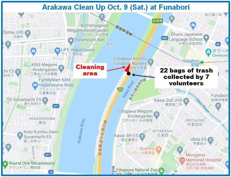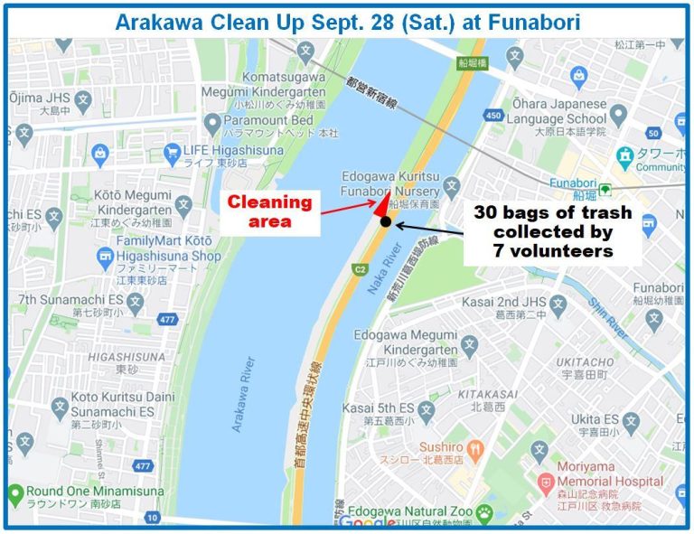 Seven volunteers collected 30 bags of trash at today's Arakawa River clean up near Funabori. Aside from the American organizer ...