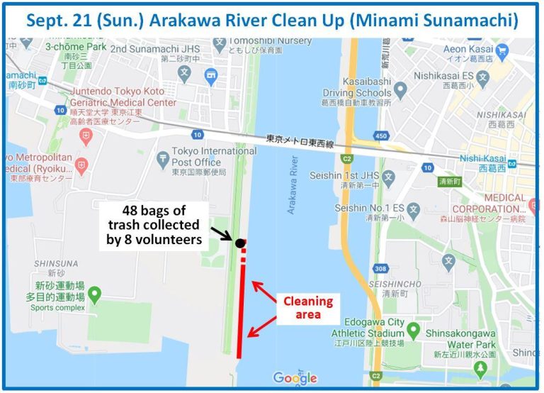 Eight volunteers collected 48 bags of trash at today's Arakawa River clean up event near Minami Sunamachi. That was 33 ...