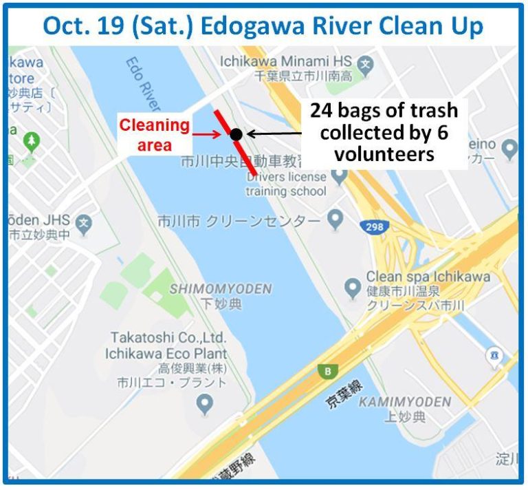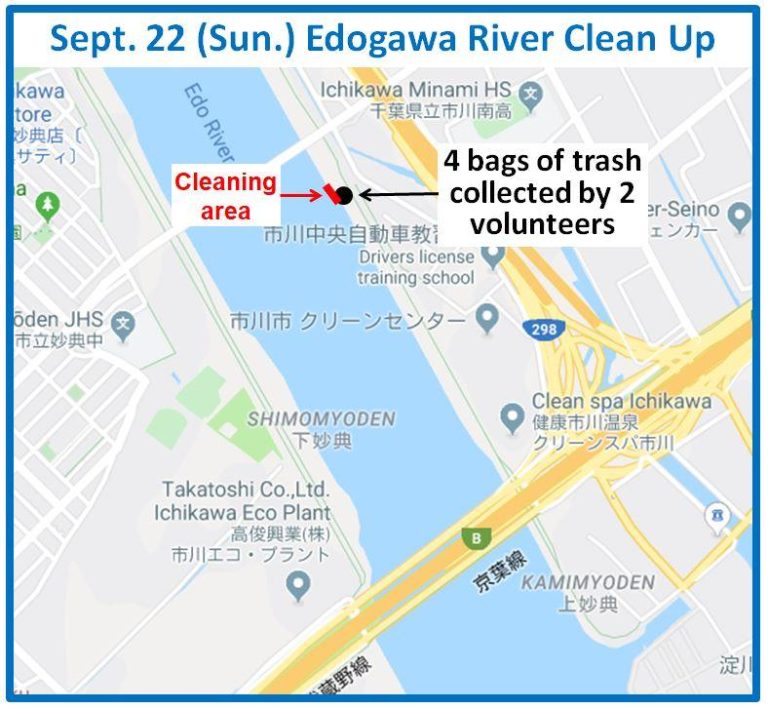 Two volunteers collected 4 bags of trash at today's Edogawa River clean up on the Barakinakayama side. Takada-san led this ...