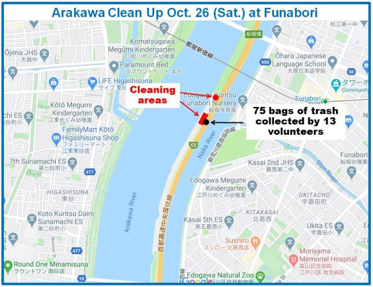 Three volunteers (all TRF veterans) collected 10 bags of trash at today's Arakawa River clean up event next to the ...