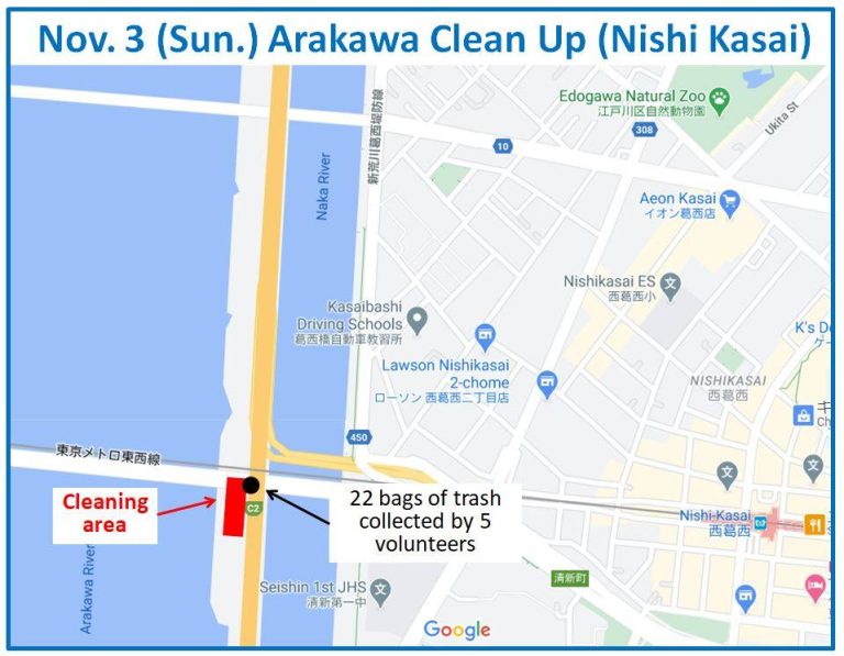 Five volunteers collected 22 bags of trash at today's Arakawa River clean up event next to the Tozai Line Bridge ...