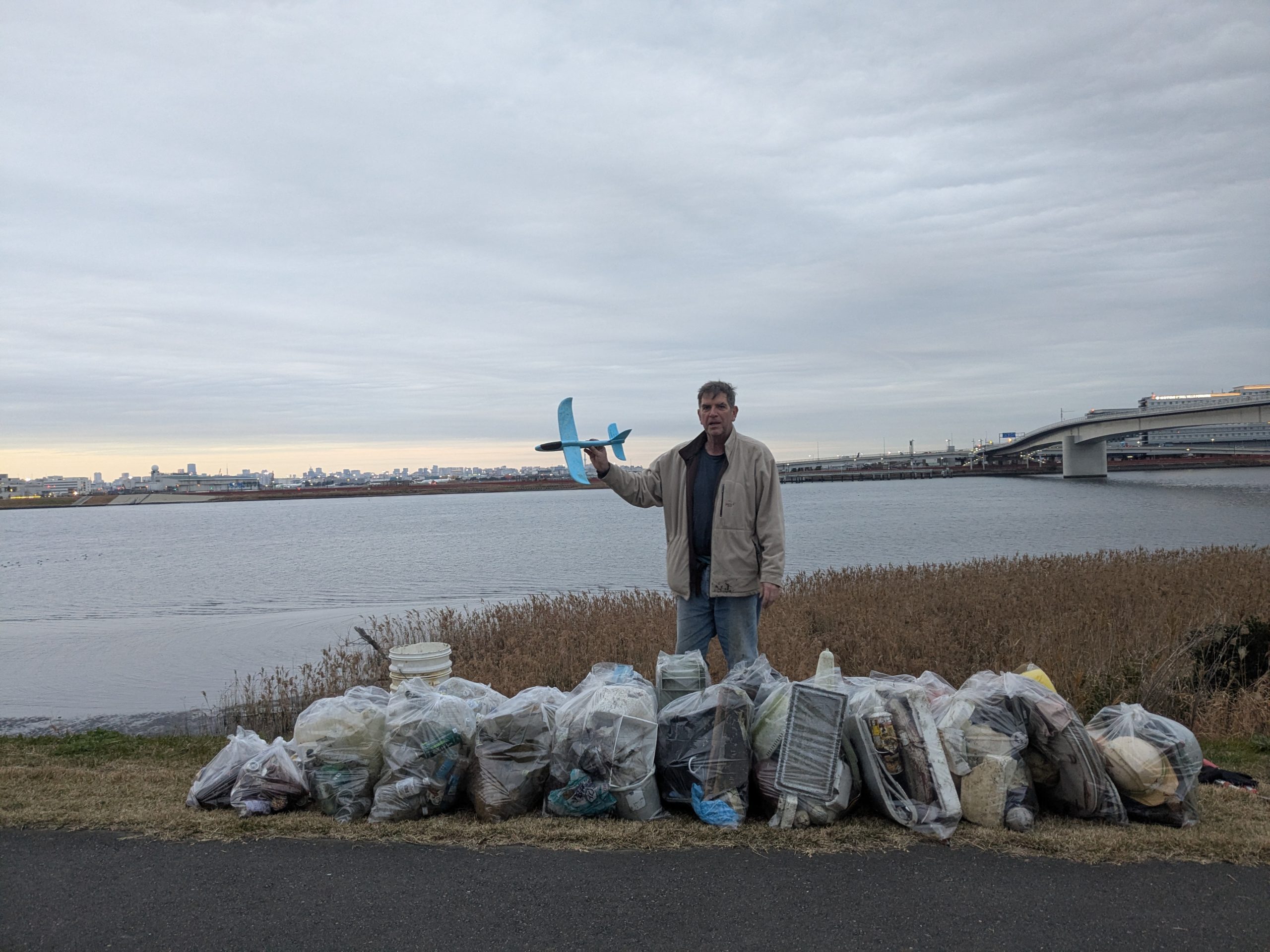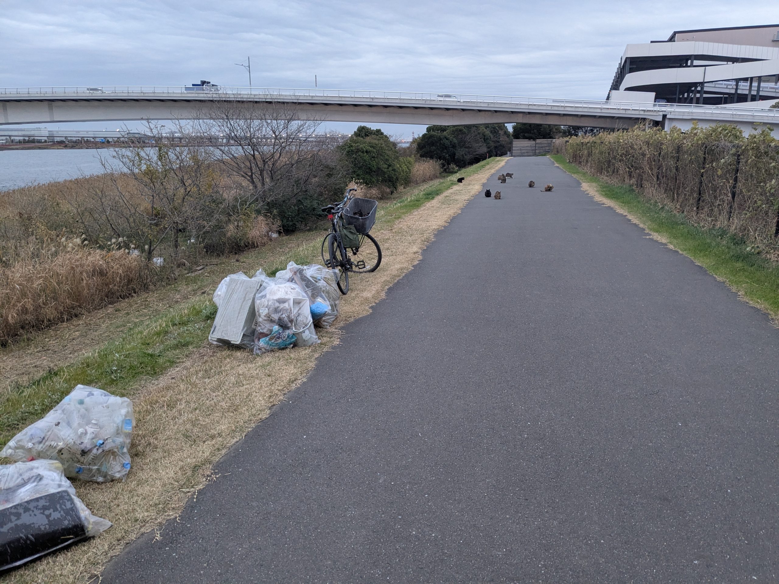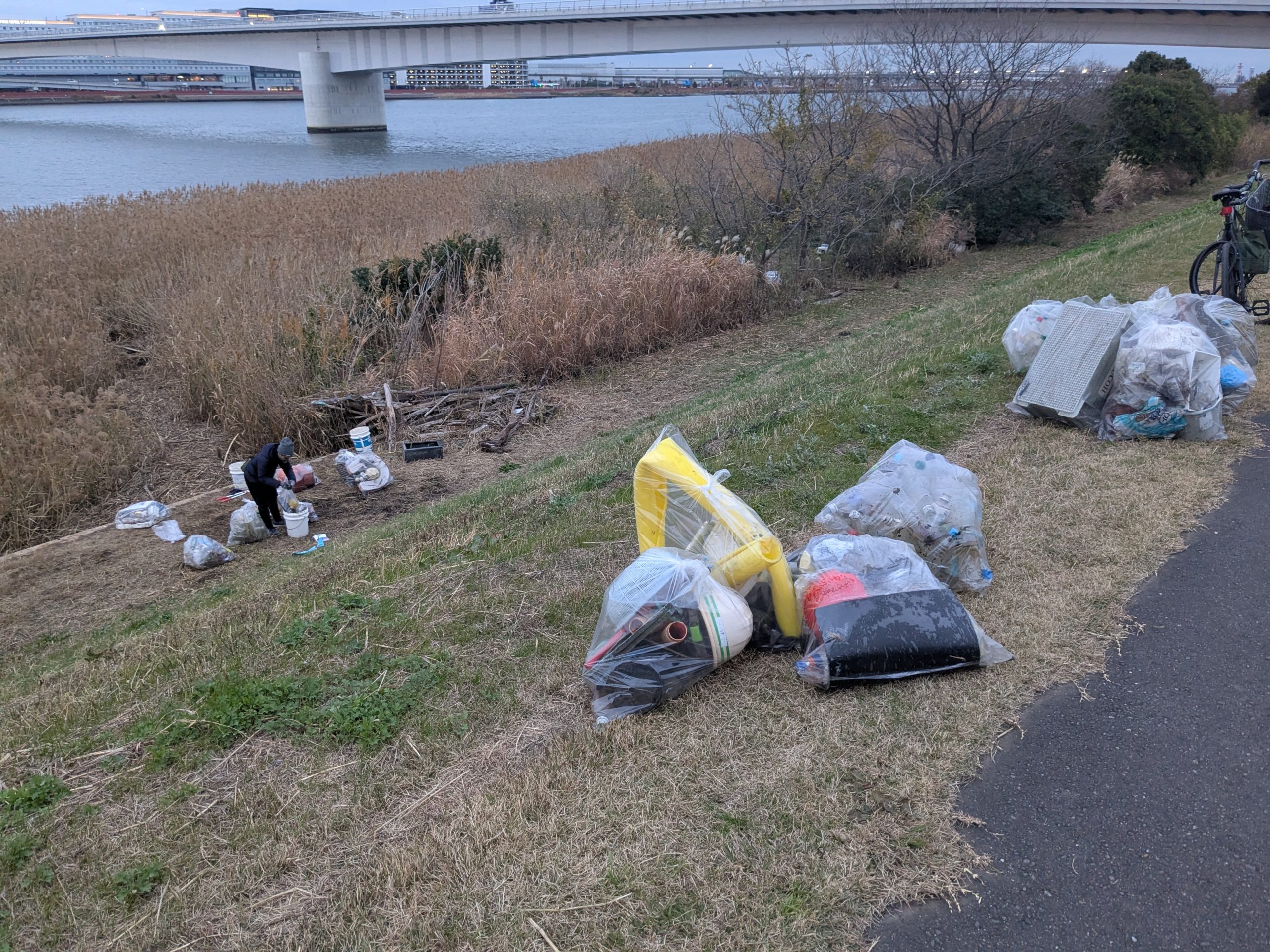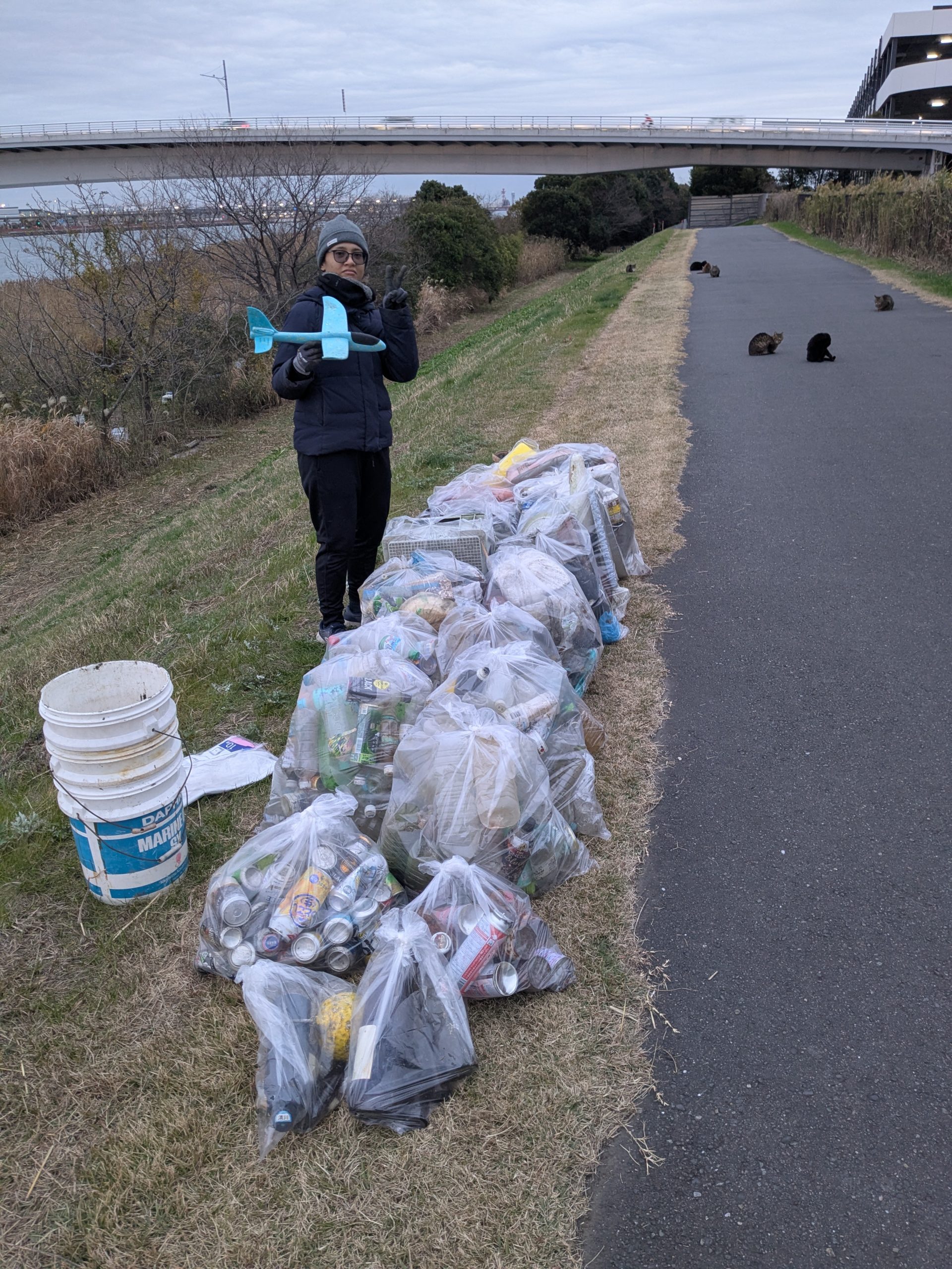 Two volunteers collected 22 bags of trash at yesterday’s Tamagawa River clean up event directly across the river from Haneda Airport. Cold weater may have kept attendance down, but yesterday was a good example of what even just two people can accomplish with a large volume of trash collected. We’re continuing to work down stream toward and beyond the bridge, but a lot of new trash had accumulated in this river’s version of the Dirty Angle where a lot of trash gets trapped. This particular location has a good size cat colony, many of which were out waiting for the evening feeding from a caretaker.