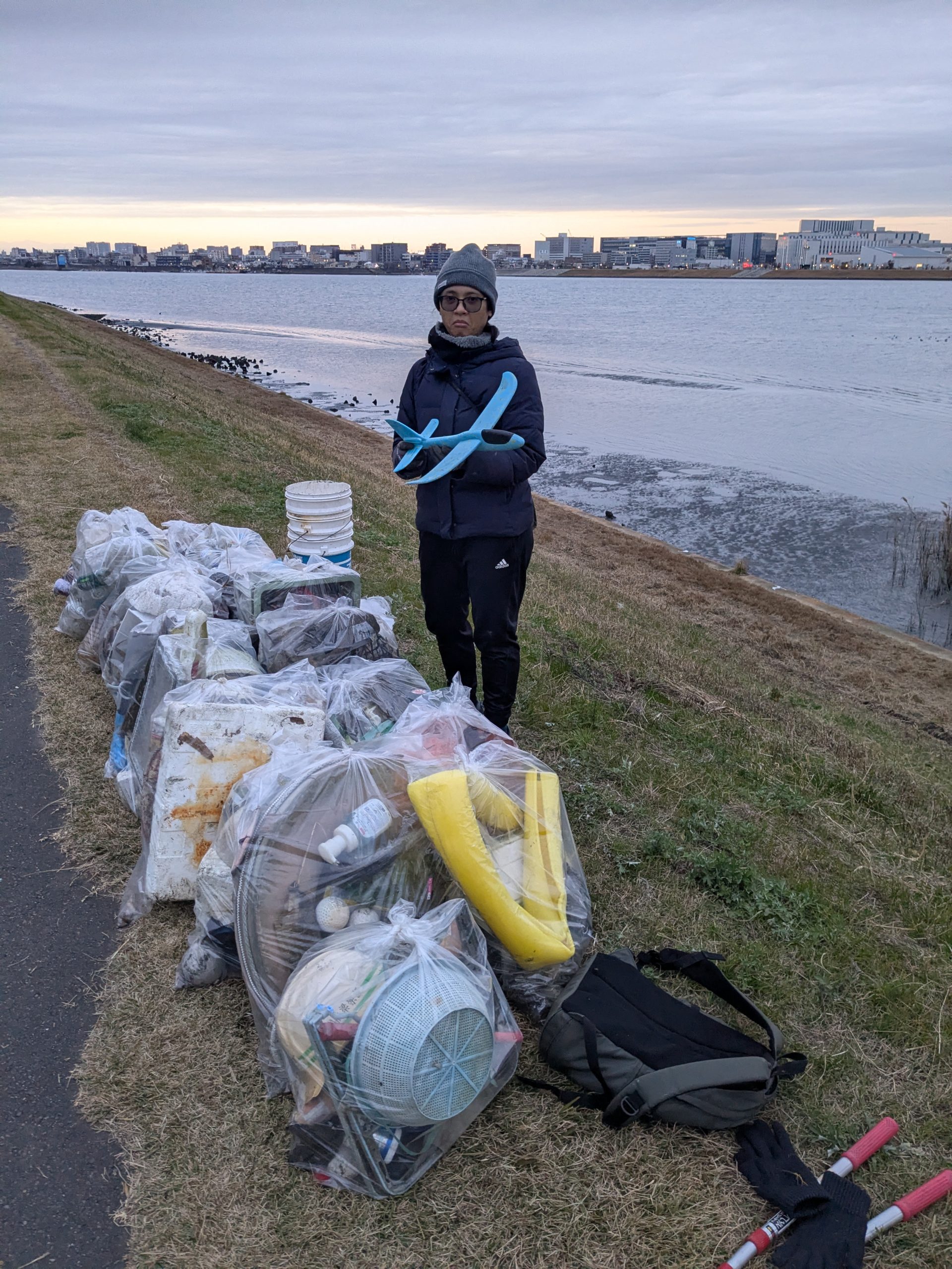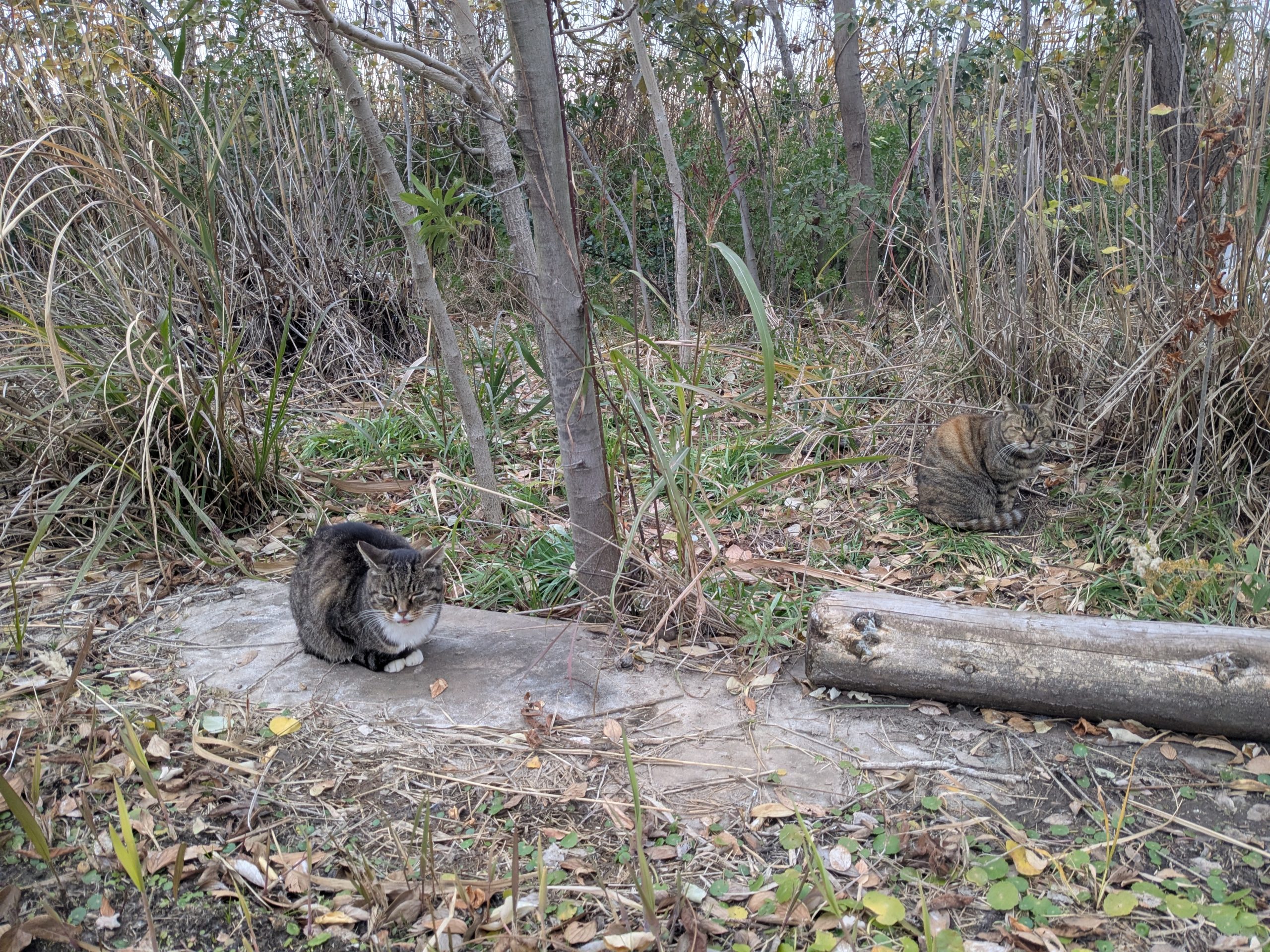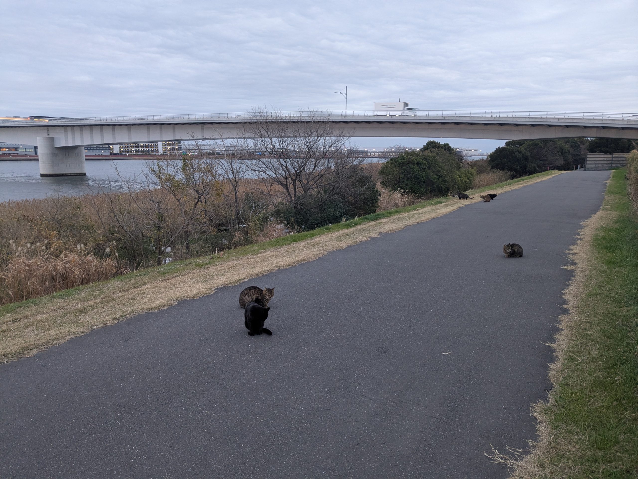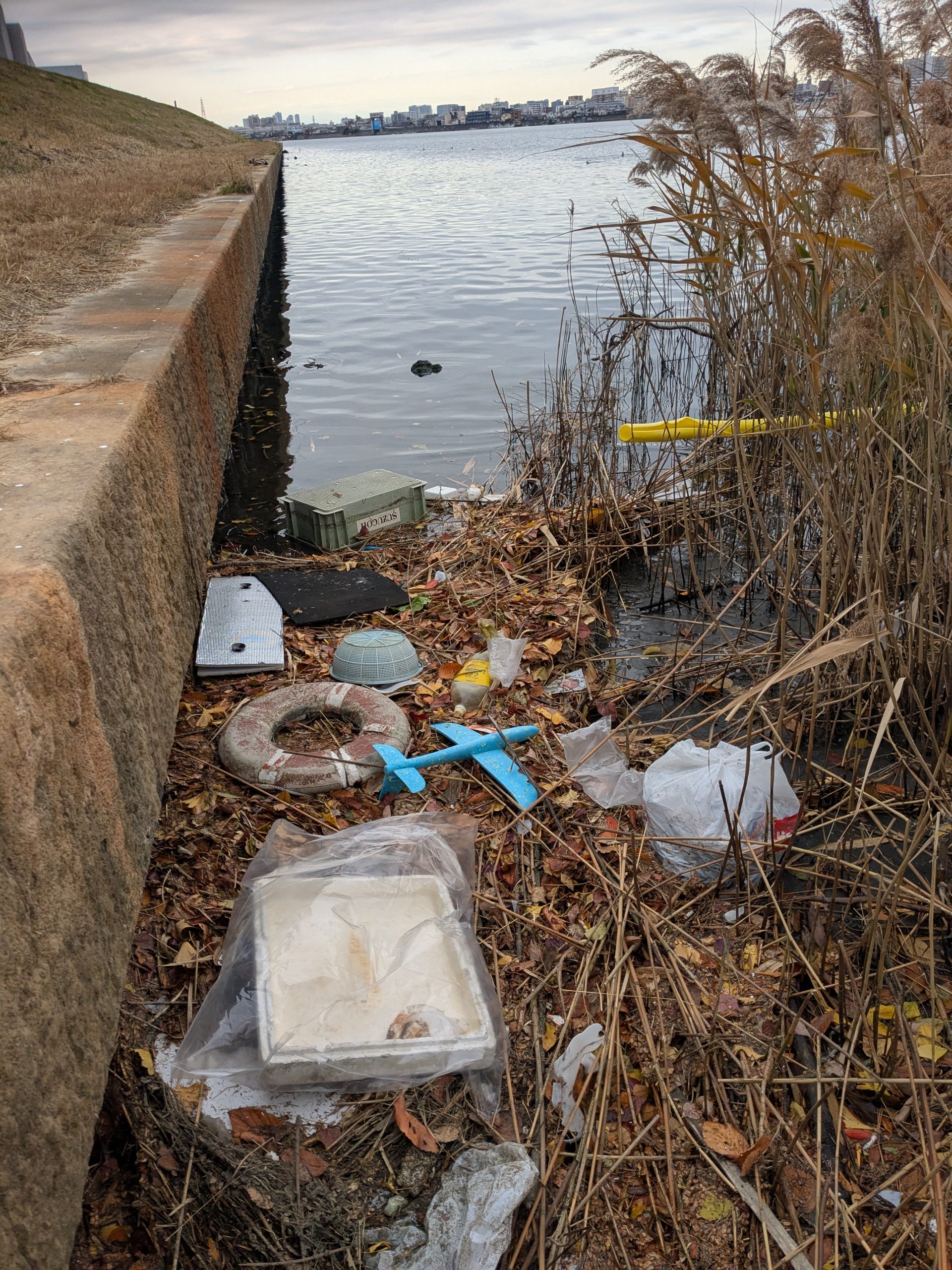 Two volunteers collected 22 bags of trash at yesterday’s Tamagawa River clean up event directly across the river from Haneda Airport. Cold weater may have kept attendance down, but yesterday was a good example of what even just two people can accomplish with a large volume of trash collected. We’re continuing to work down stream toward and beyond the bridge, but a lot of new trash had accumulated in this river’s version of the Dirty Angle where a lot of trash gets trapped. This particular location has a good size cat colony, many of which were out waiting for the evening feeding from a caretaker.