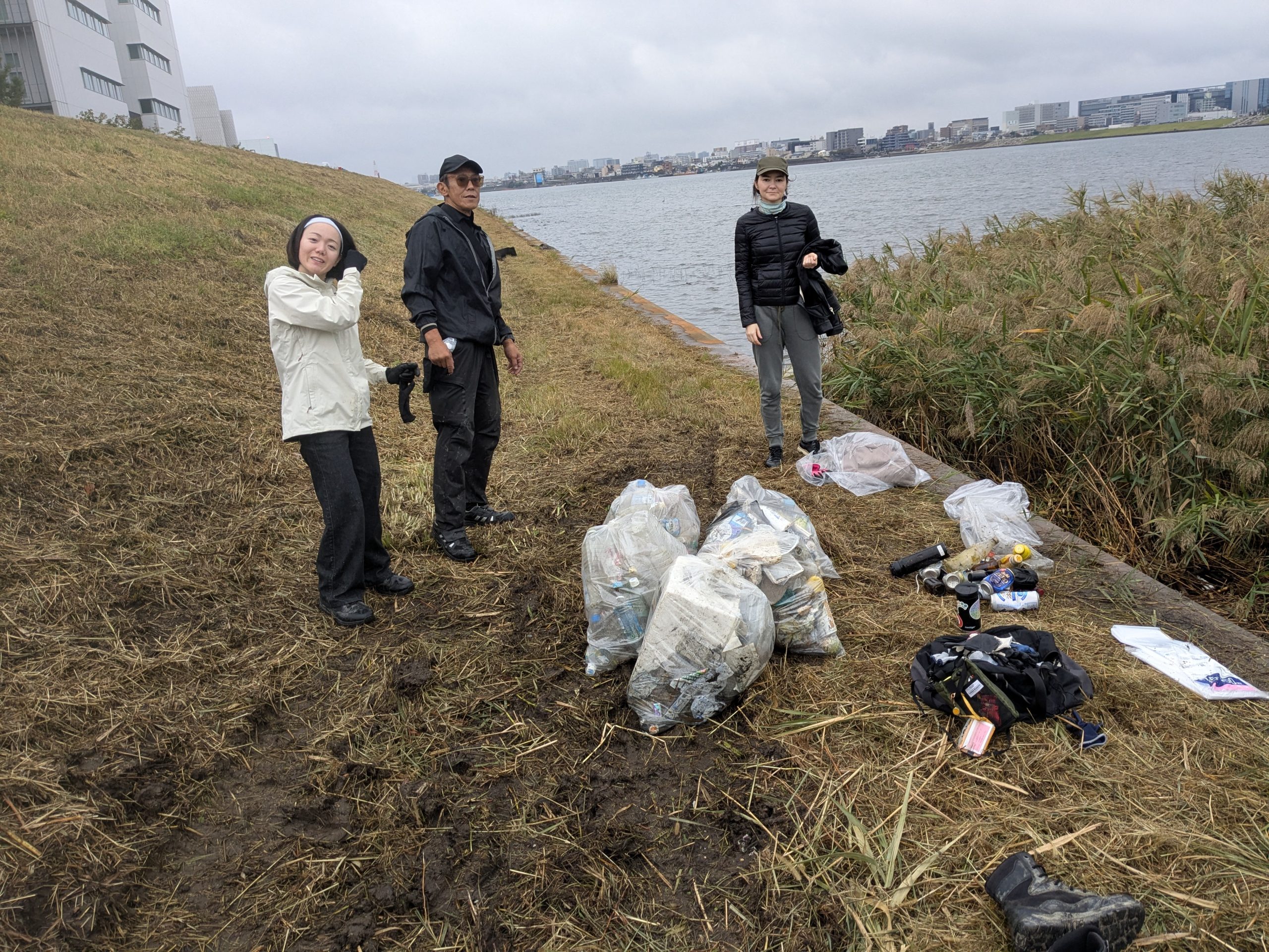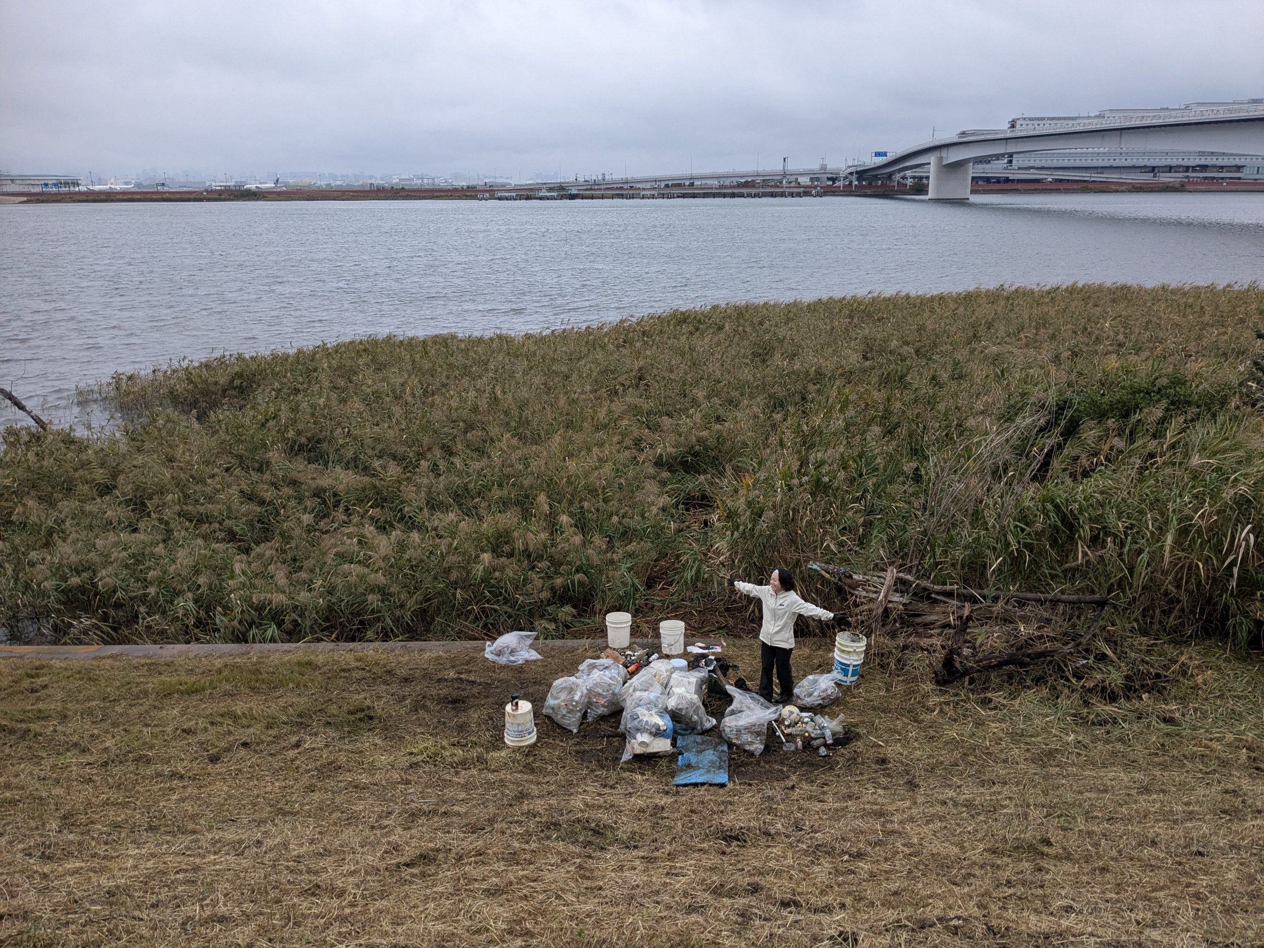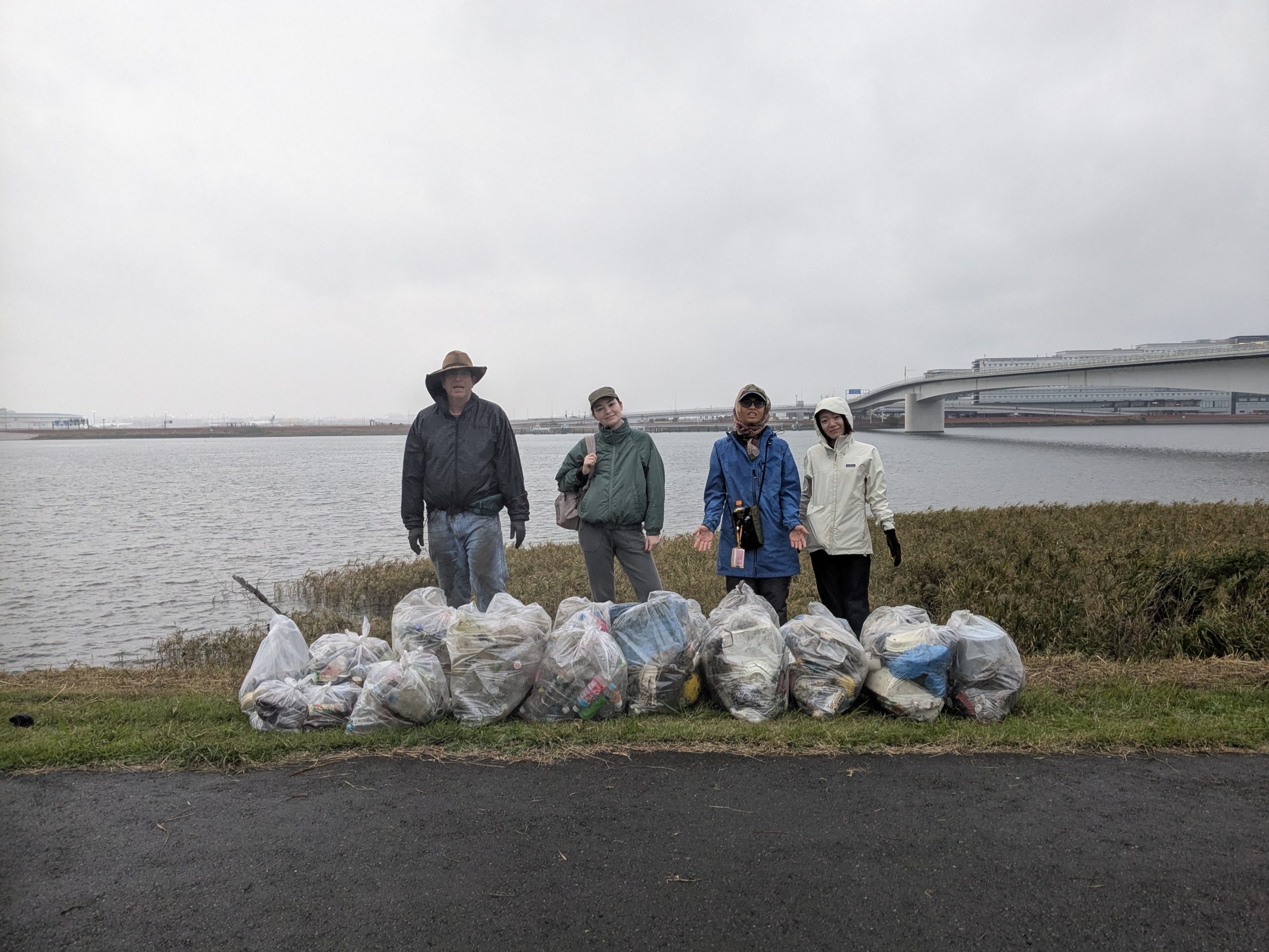 Five volunteers collected 19 bags of trash at today’s Tamagawa River Clean Up event just across the river from Haneda Airport. Special thanks to everyone for braving the rain forecast, which turned out to be only a little drizzle. We had pretty well cleaned this area in past years but today collection was new accumulation. This protruding area is kind of like a filter that needs regular cleaning. Mina-san otsukaresama for a great effort today.