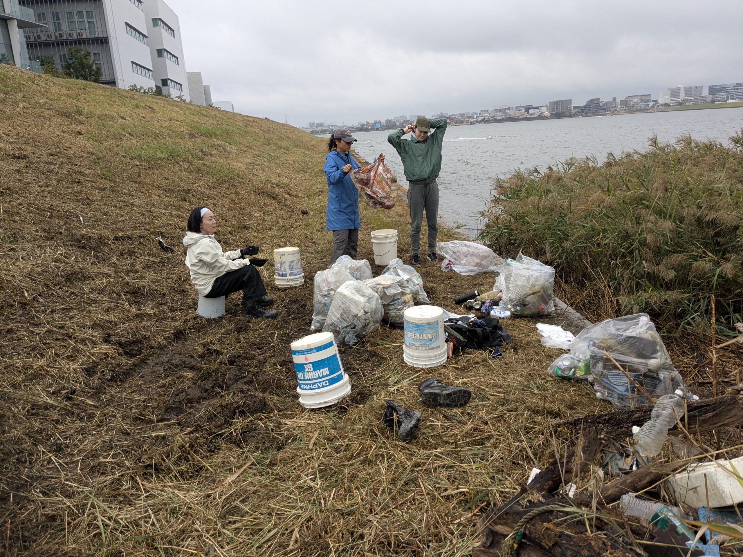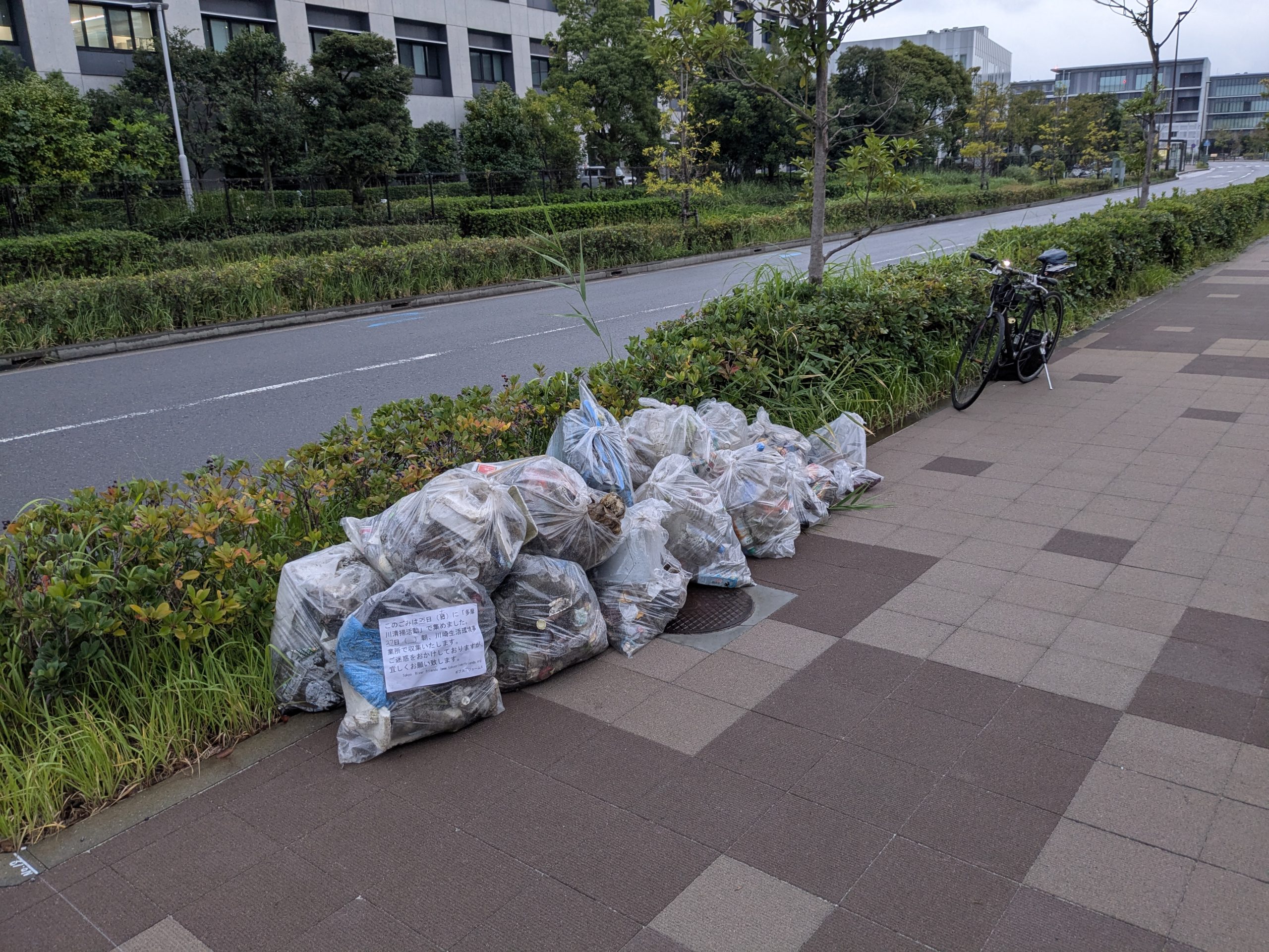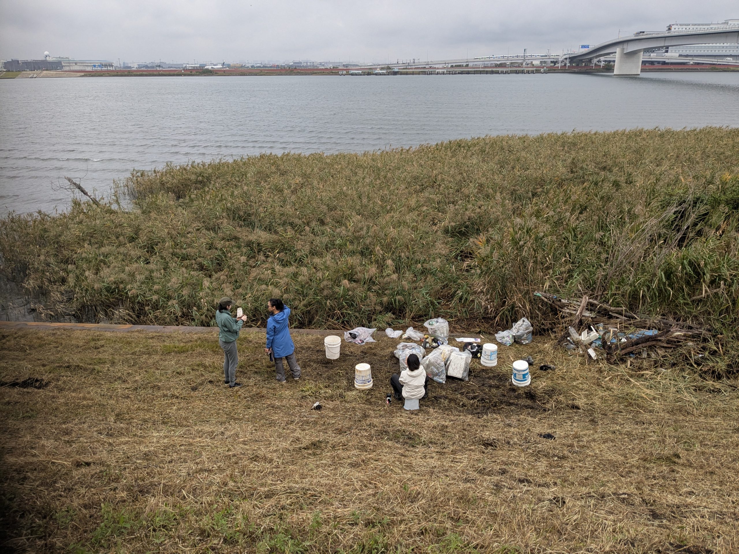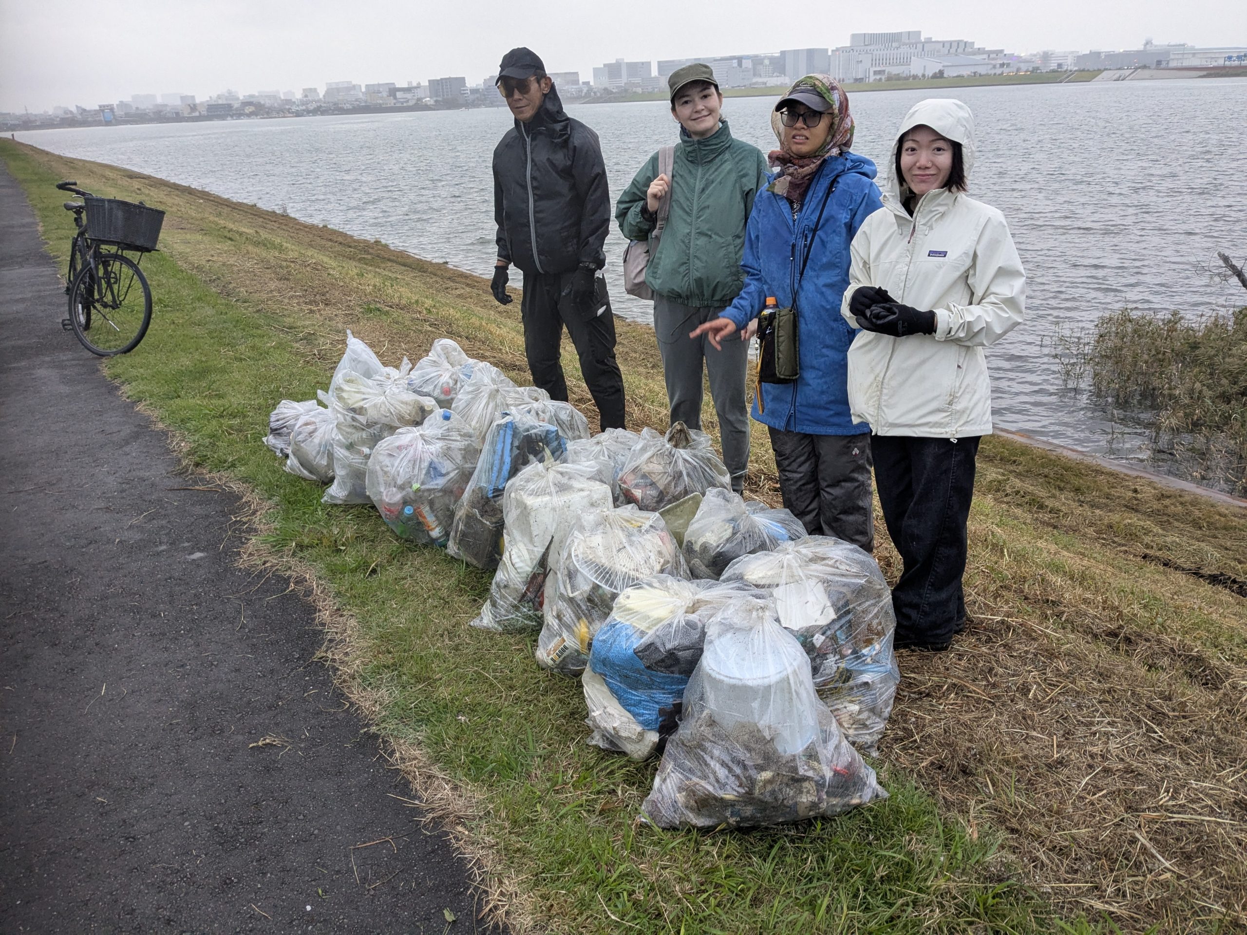 Five volunteers collected 19 bags of trash at today’s Tamagawa River Clean Up event just across the river from Haneda Airport. Special thanks to everyone for braving the rain forecast, which turned out to be only a little drizzle. We had pretty well cleaned this area in past years but today collection was new accumulation. This protruding area is kind of like a filter that needs regular cleaning. Mina-san otsukaresama for a great effort today.